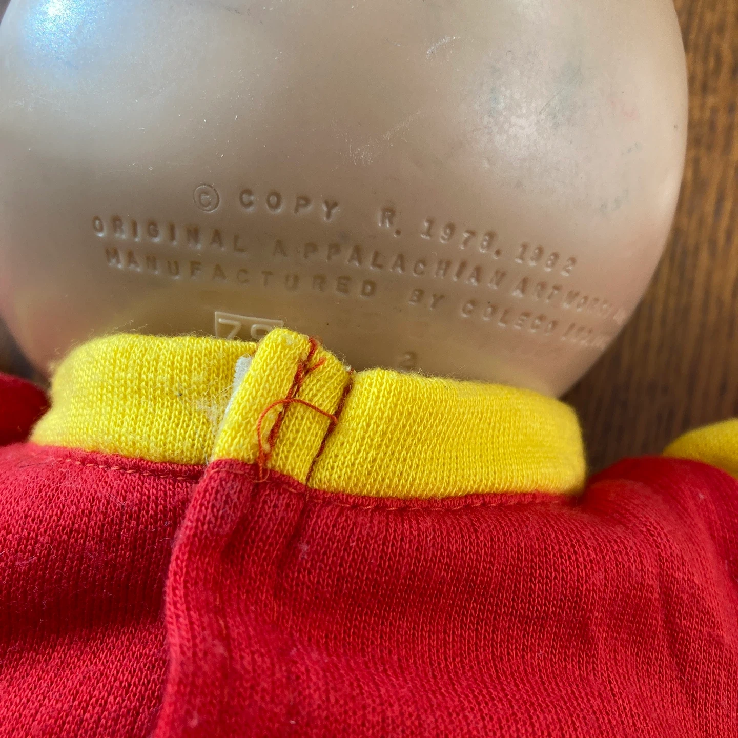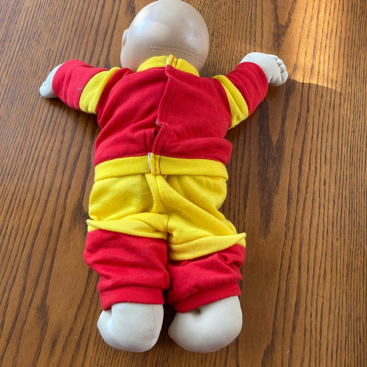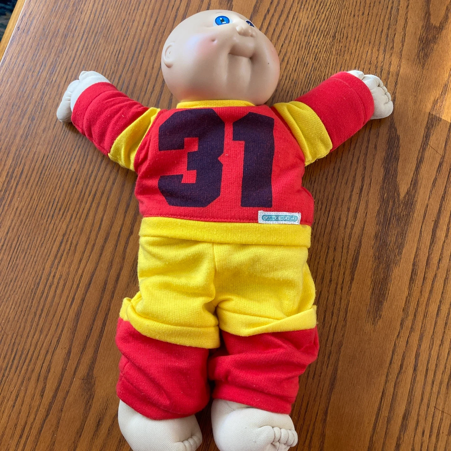 This is a Cabbage Patch Kid doll from 1985. It's wearing a red and yellow outfit with the number 31 on the front. The doll's body is made of polyester fibre.