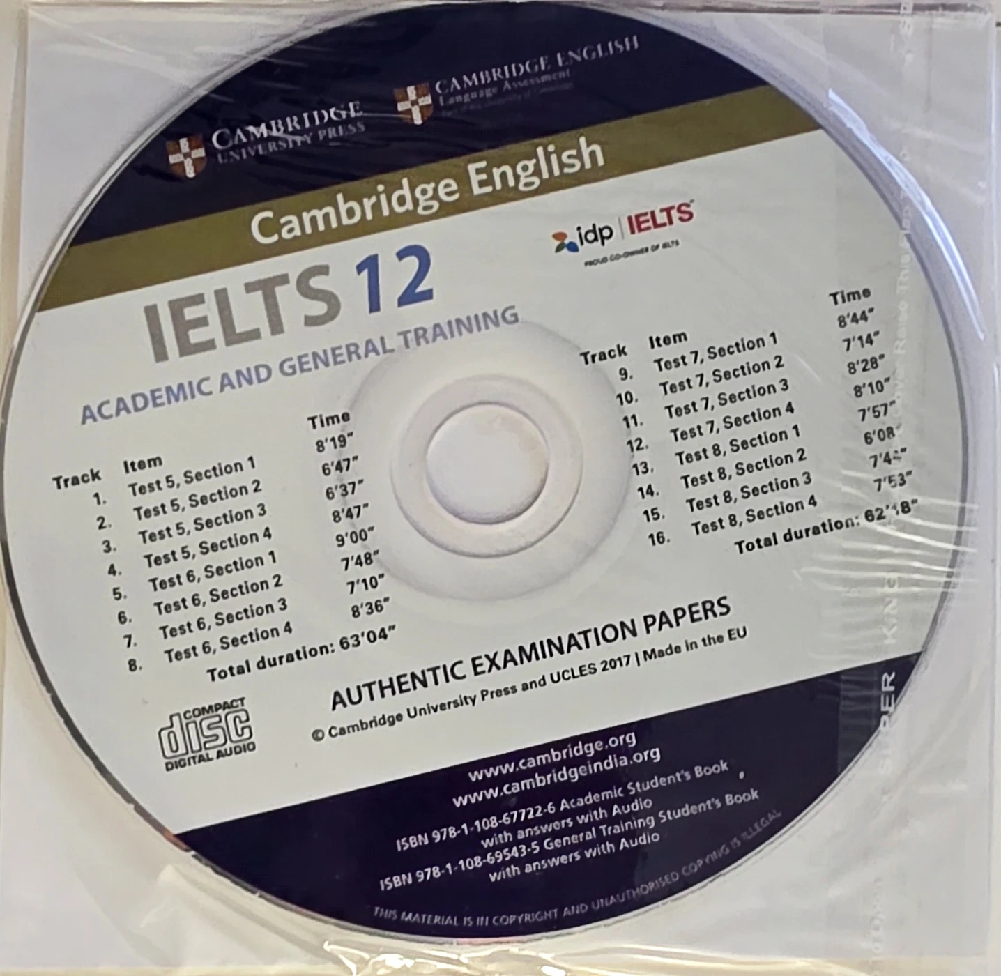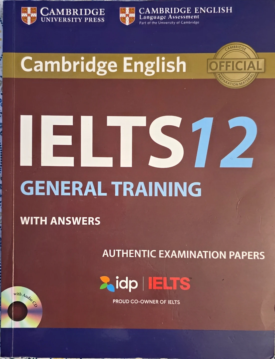 This is Cambridge English IELTS 12 for General Training. It includes authentic examination papers with answers and an accompanying audio CD. It's published by Cambridge University Press.