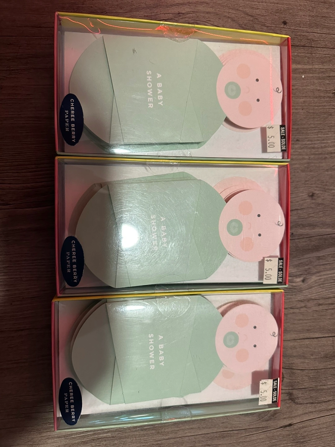 I have three sets of Cheree Berry Paper baby shower invitations. Each set is brand new in its original packaging, just have no use for them.