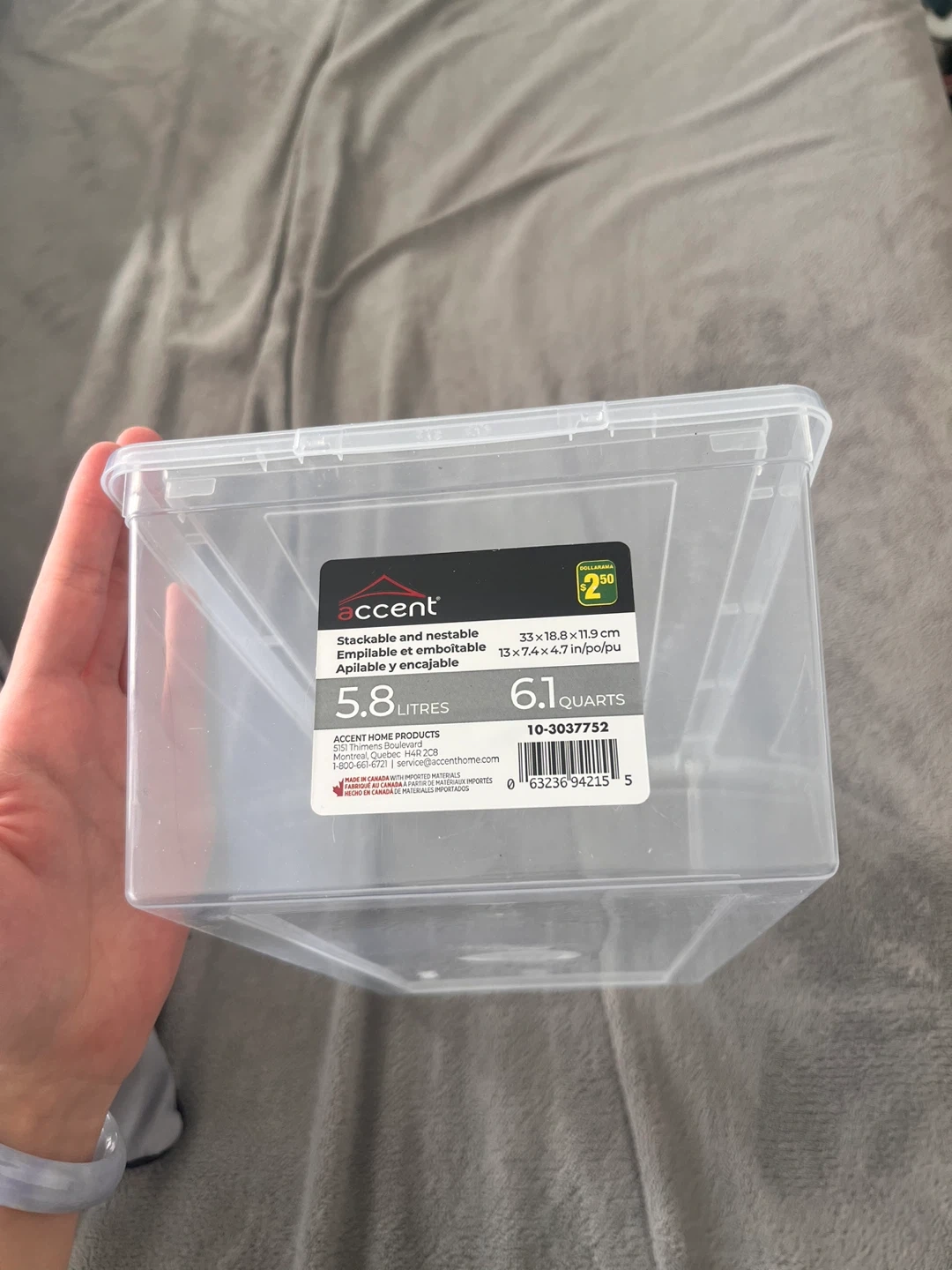 Accent stackable storage bin. Holds 5.8 litres or 6.1 quarts. Dimensions are 33 x 18.8 x 11.9 cm. Made of plastic. This bin is stackable and nestable.