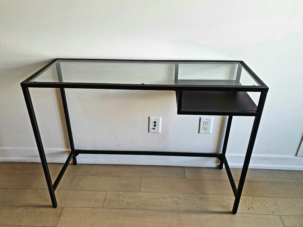 In sleek black-brown with glass top, offering a stylish and practical solution for your workspace. Purchased with care and maintained since, this laptop table is not just aesthetically pleasing (9/10) but also functionally flawless, earning a solid 10/10 rating. As we prepare for a move, we're reluctantly parting with this versatile piece that effortlessly combines modern design with functionality.