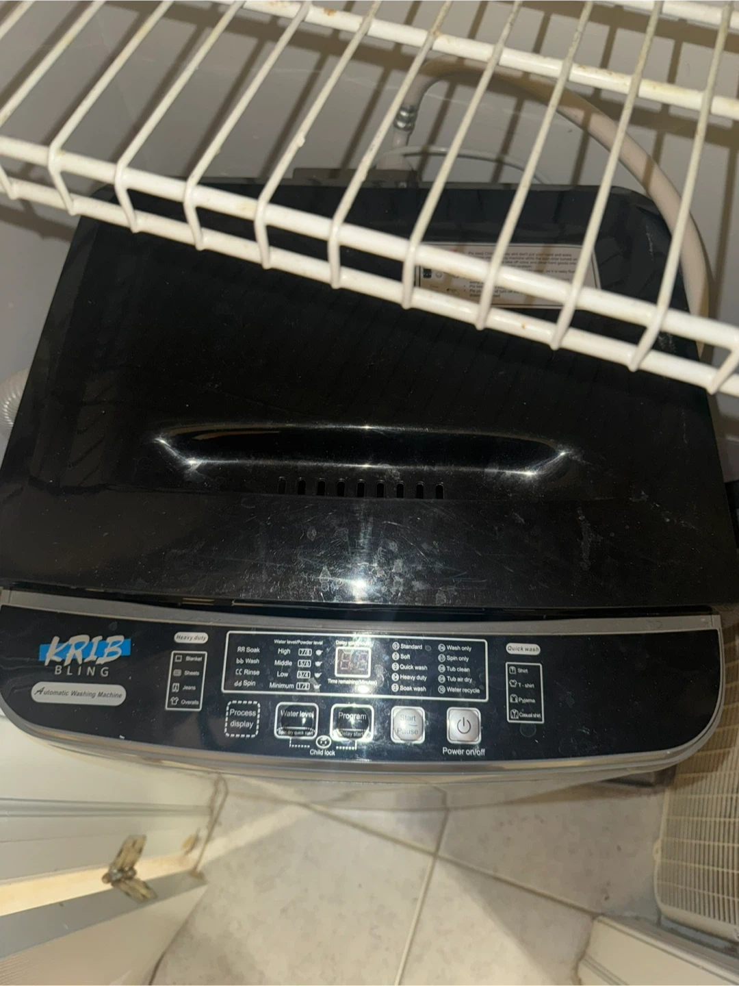This is a KRIB BLING automatic washing machine. It's a compact top-load model with multiple wash cycles. Digital display shows program options.