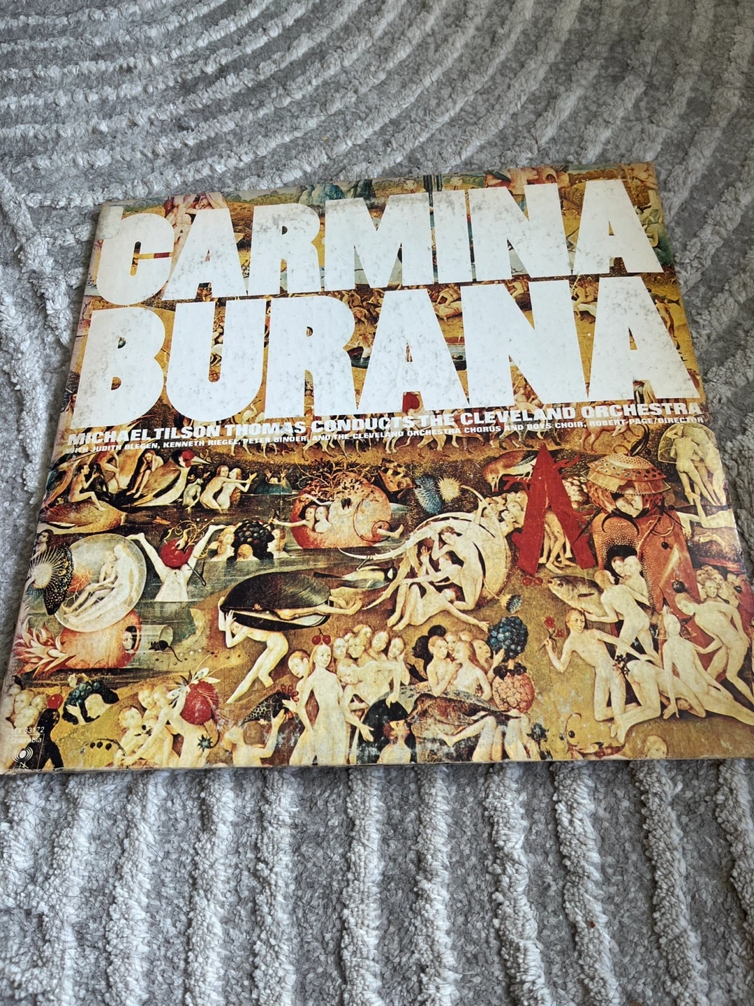 Carmina Burana vinyl record conducted by Michael Tilson Thomas. Features Judith Blegen, Kenneth Riegel, and the Cleveland Orchestra Chorus and Boys Choir. This is a 12-inch LP.