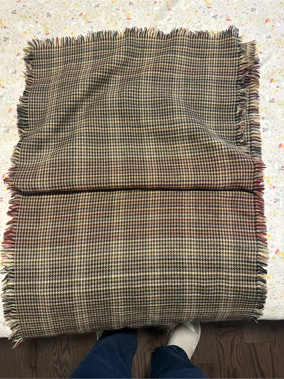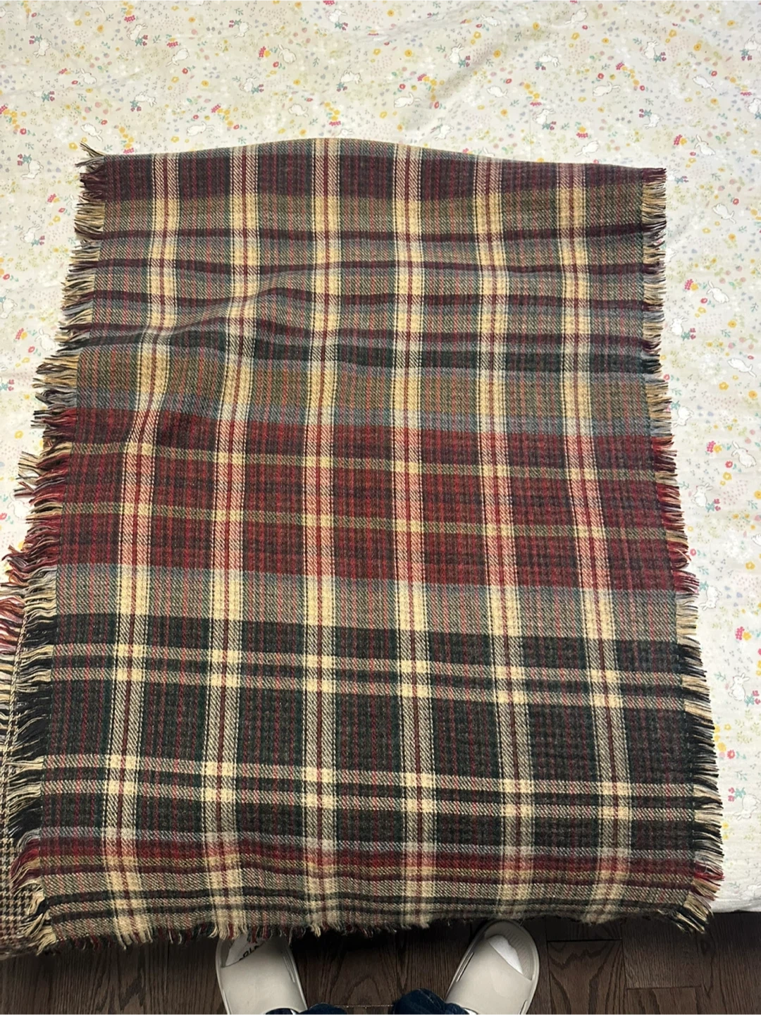 Here's a cozy wool throw scarf with a classic plaid pattern! It's perfect for adding a touch of warmth and style to your home. The blanket features fringed edges. It's in great condition, ready to keep you snug on chilly evenings