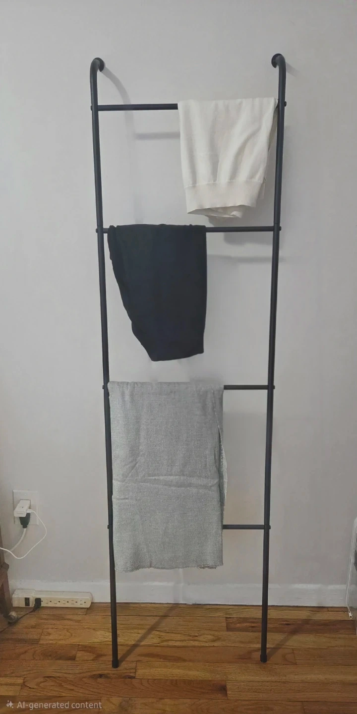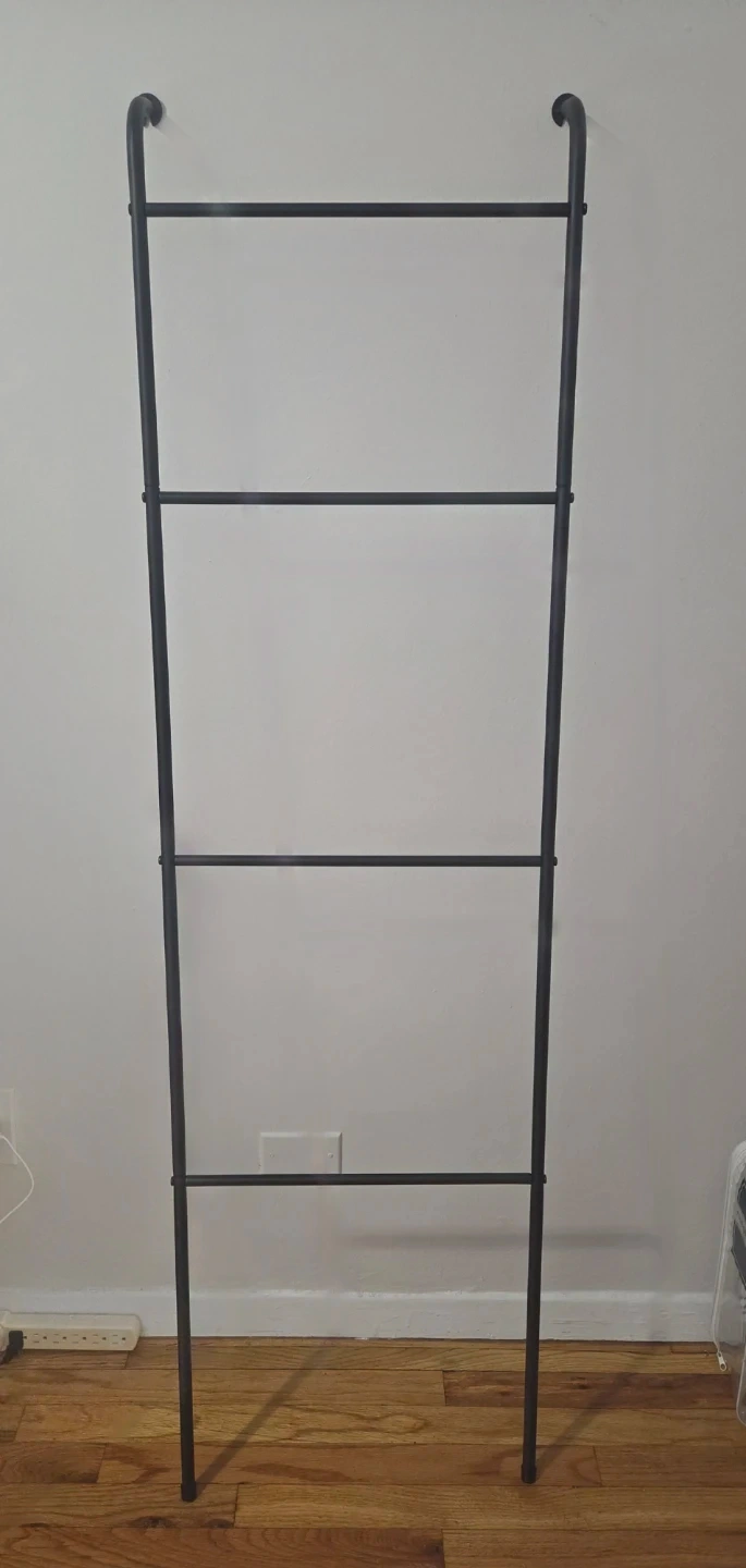 This lightweight black metal ladder features five rungs for hanging blankets, towels, or clothes. It's a stylish way to keep your items accessible and displayed. Great for bedrooms or bathrooms! Made of powder coated aluminum. Partially dissambled in half to easily carry & reassemble.