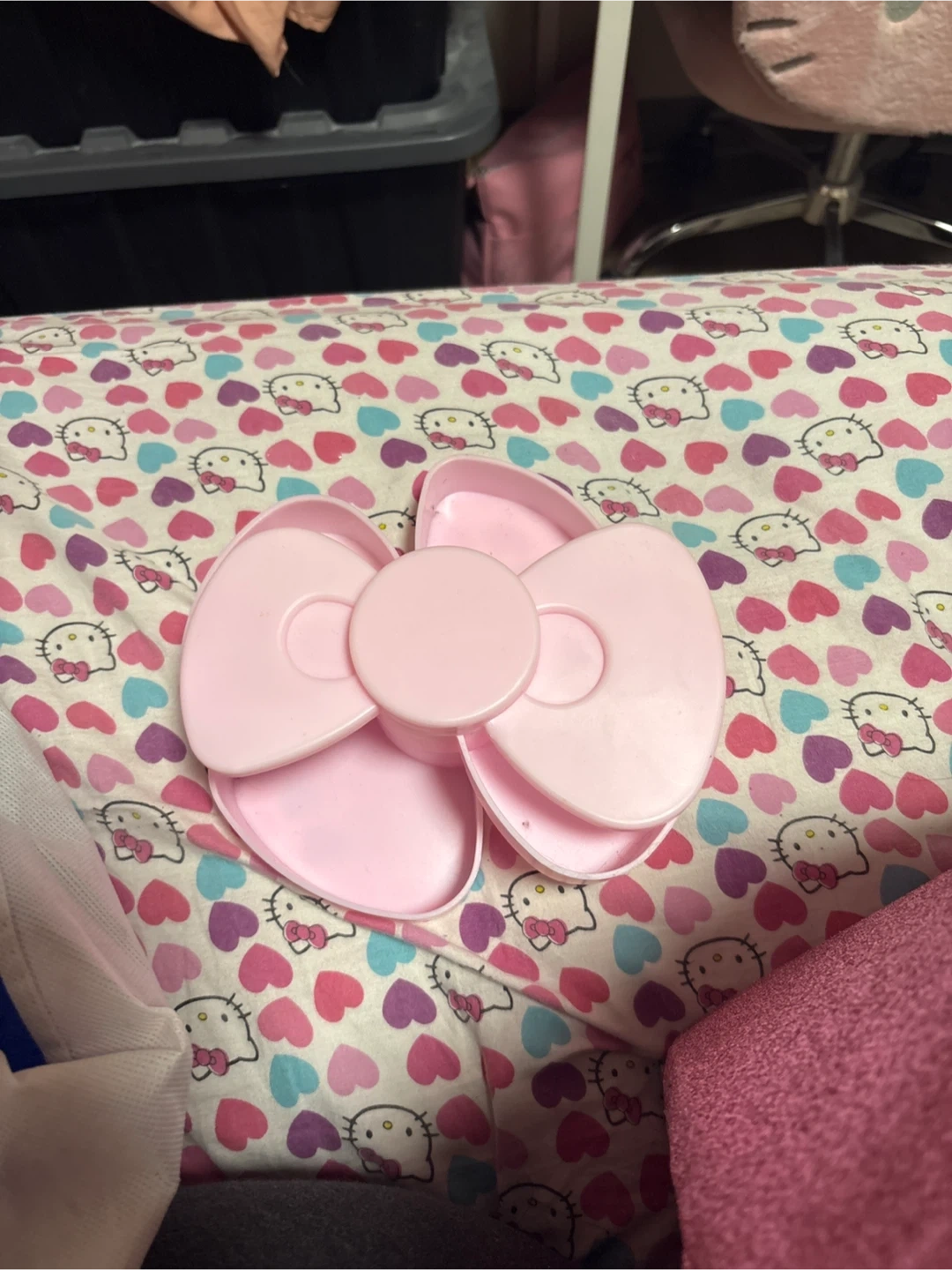 This is a pink, bow-shaped container featuring the iconic Hello Kitty design. It's perfect for storing small trinkets or accessories. The plastic construction makes it durable and easy to clean.