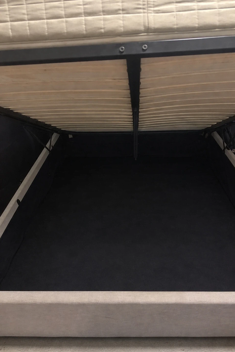 This is a grey upholstered bed frame with a tufted headboard and decorative stud accents. It features a built-in storage space underneath the mattress. The frame is constructed with a sturdy metal support system and wooden slats. Perfect for keeping your bedroom tidy!