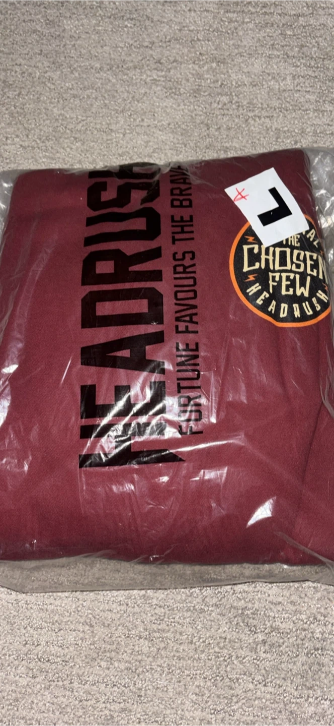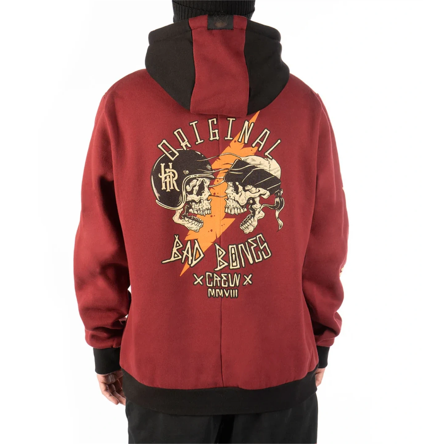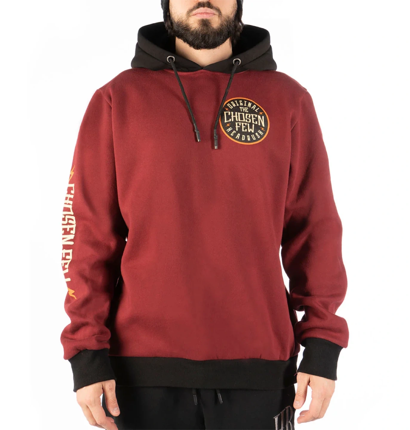 This is a "The Chosen Few" hoodie featuring "Bad Bones" graphic artwork. It's a burgundy colour with black accents on the hood, cuffs, and waistband. The sleeves have "The Chosen Few Headrush" text printed on them.