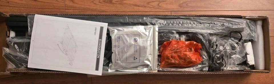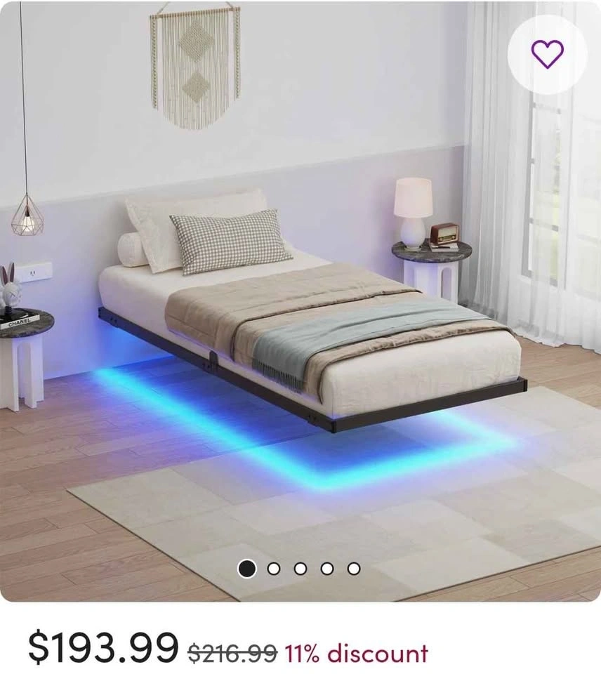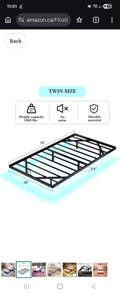 Modern twin bed frame with a cool floating design and RGB LED lights. The lights offer 20 colors, adjustable brightness, and a timer function. Made with super durable material and designed for no noise. Weight capacity is 1000 lbs. Dimensions are 75" long, 39" wide, and the frame is 6.5" high. Still in the original box. Original price was $193 plus tax.