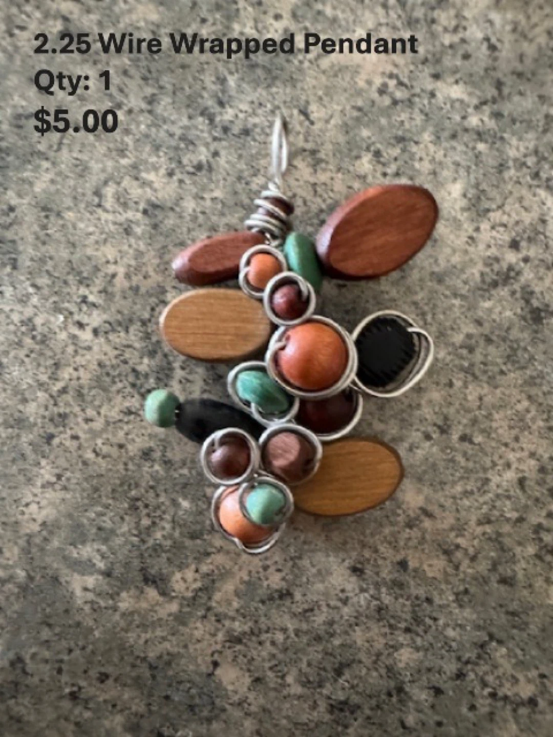 This pendant features a unique wire-wrapped design with wooden beads and colourful accent stones. It's approximately 2.25 inches in length and includes a silver-tone bail for hanging. A lovely piece for adding a handmade touch to your outfit!