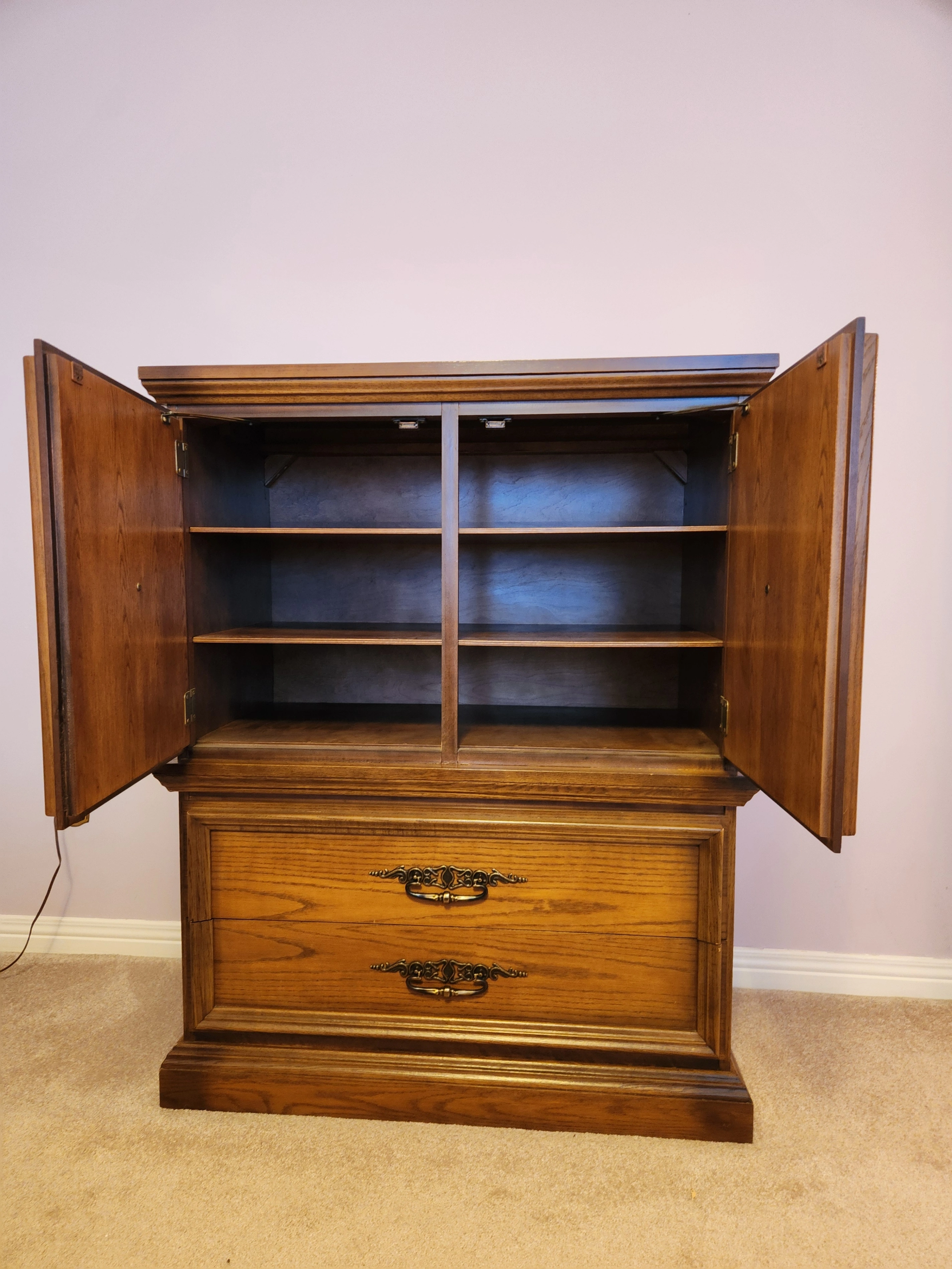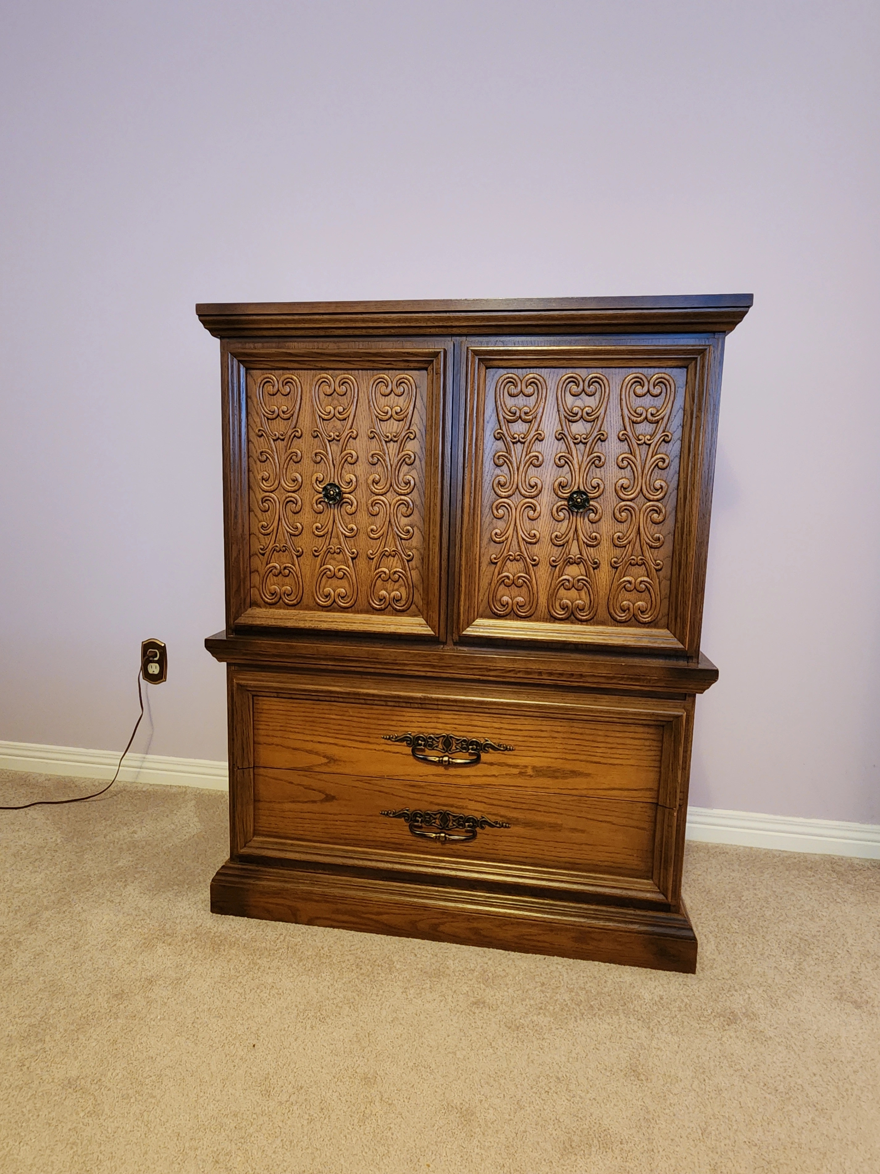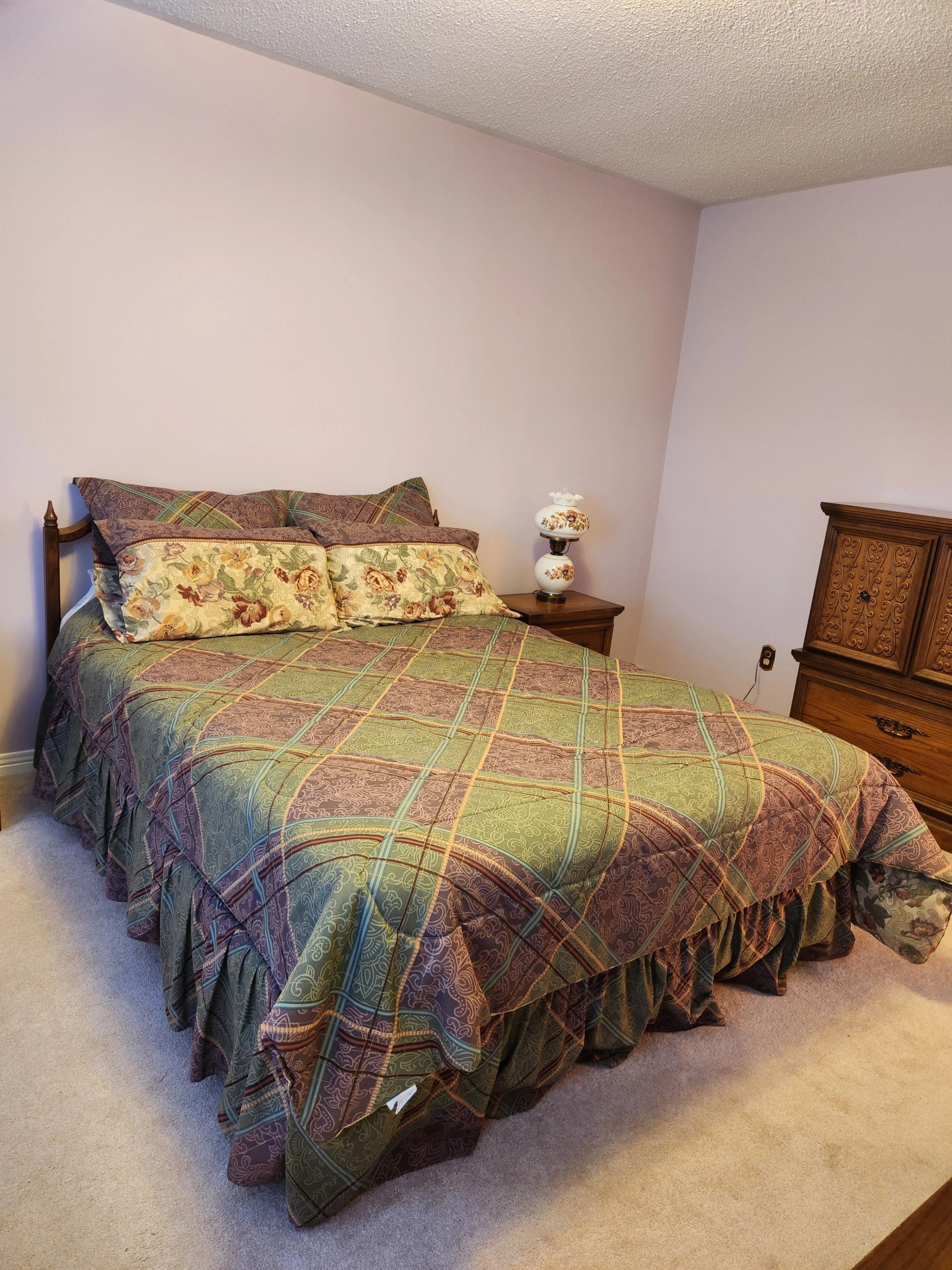 Selling a beautiful vintage 6-piece solid wood bedroom set. It includes a long dresser with a mirror, an armoire, two nightstands, and a queen bed frame with headboard and footboard. The set has a lovely wood finish with ornate detailing. It's perfect for adding a touch of classic charm to your bedroom!