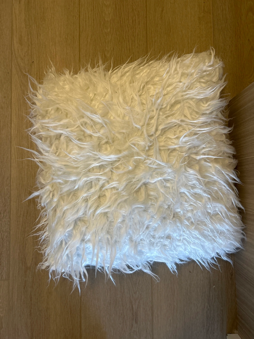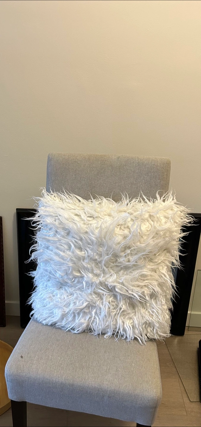 Cozy white pillow with long faux fur. It's a great way to add texture to your couch or armchair. Its fluffy material is soft to the touch. Measures approximately 18x18 inches. from no pet no smoking home