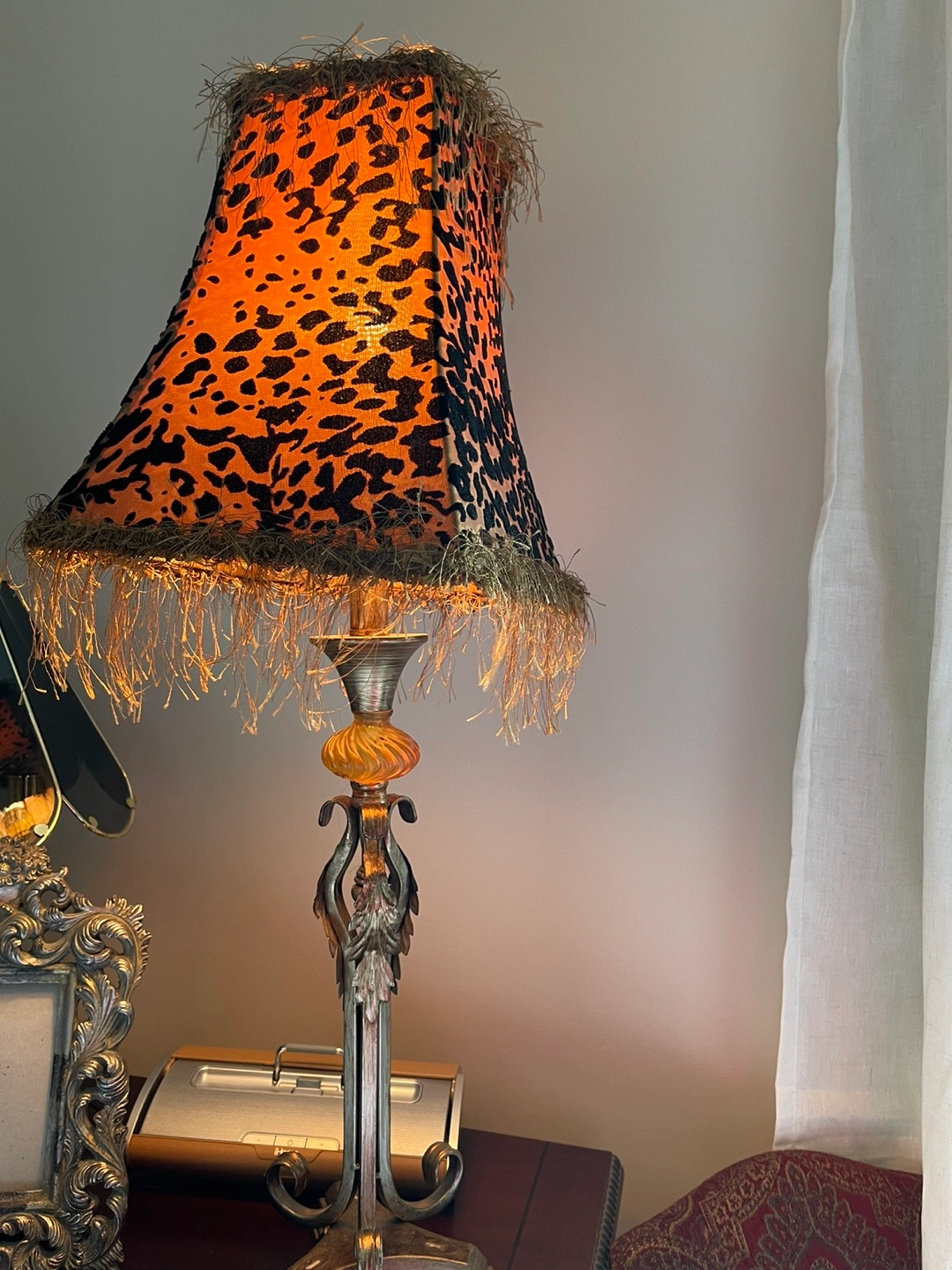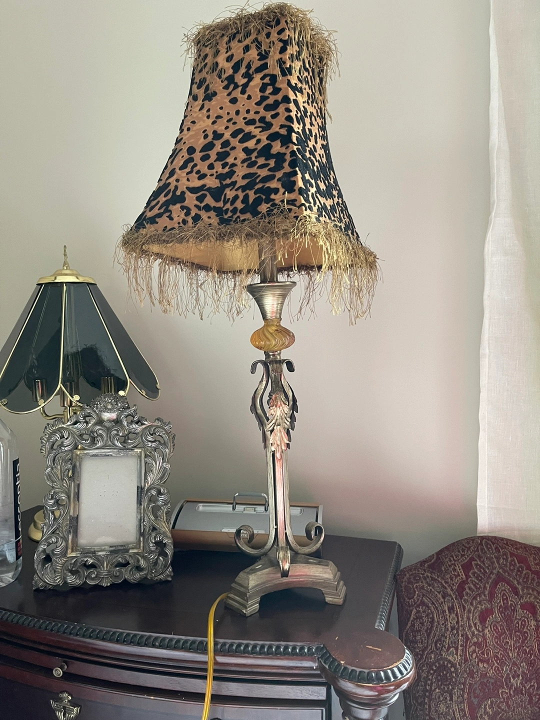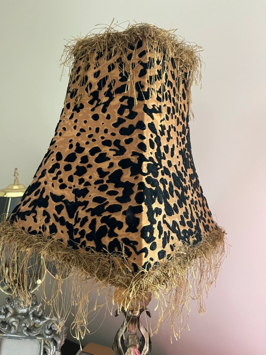 Table lamp with a leopard print shade and a gold and silver base. The shade has a fringe trim. Is missing the little cover at the top can be easy replace I will take a picture of the at request any questions don't hesitate to ask