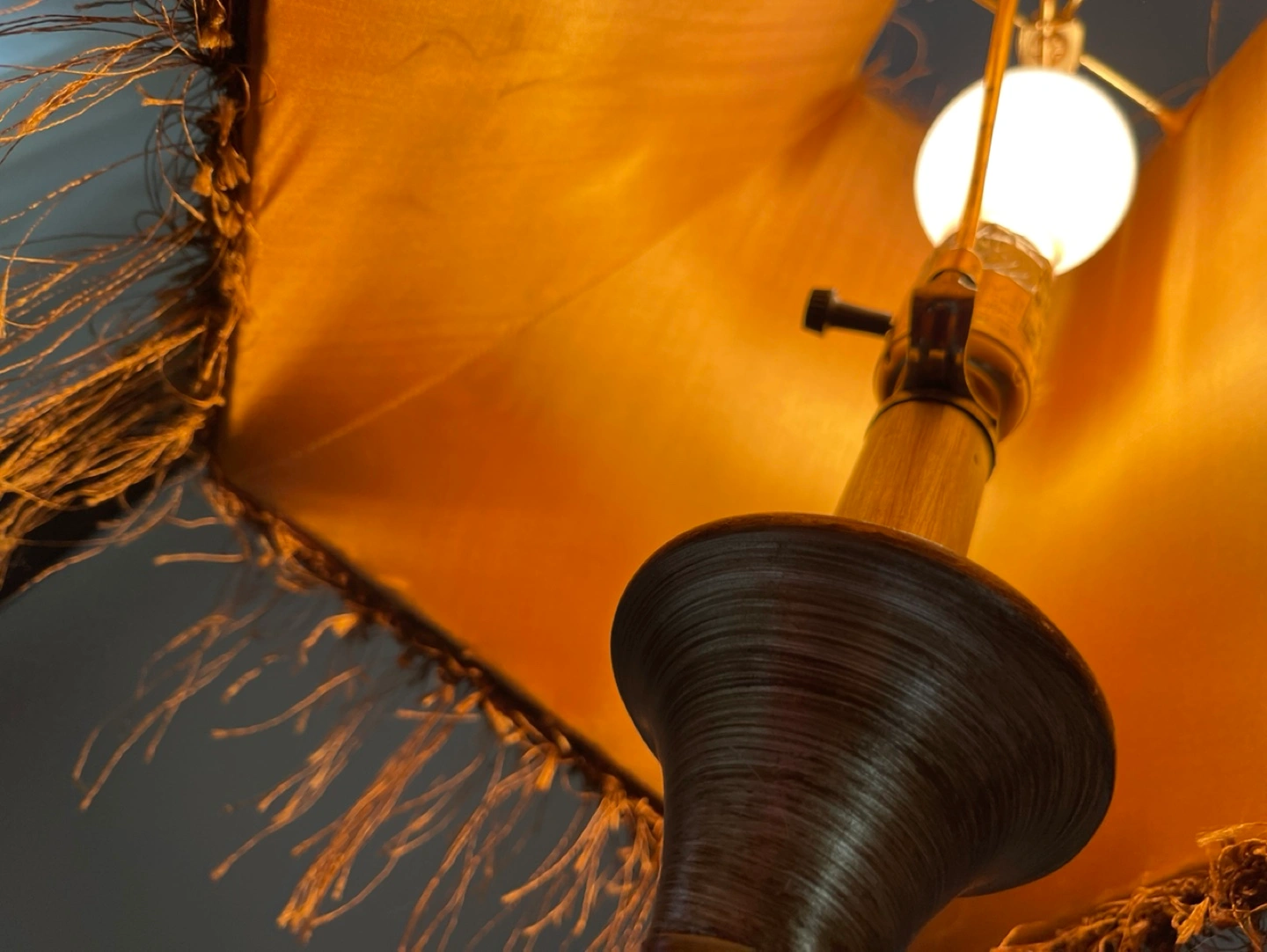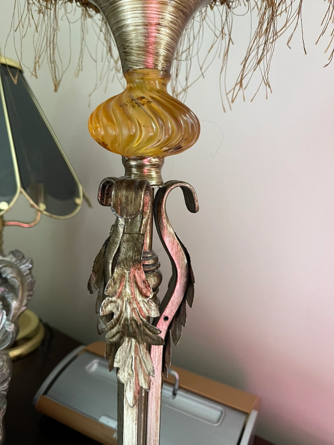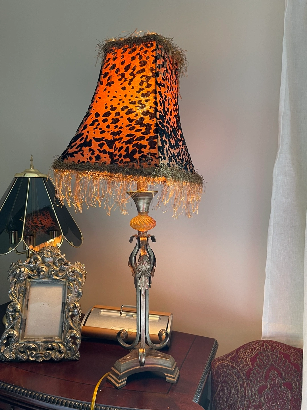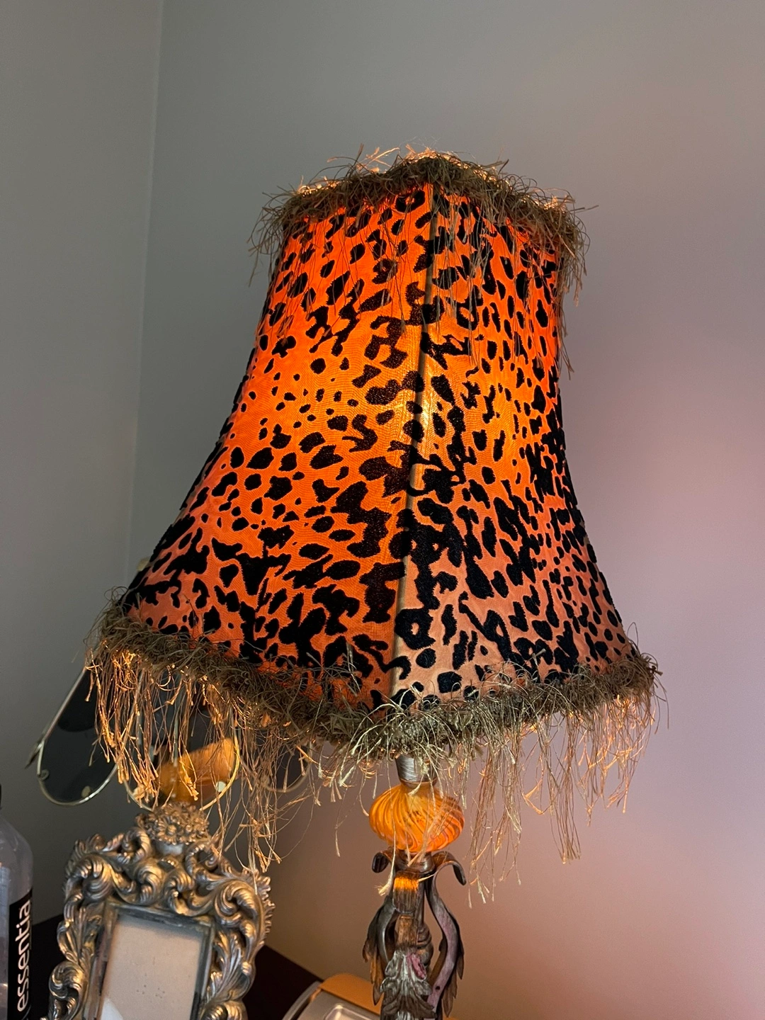 Table lamp with a leopard print shade and a gold and silver base. The shade has a fringe trim. Is missing the little cover at the top can be easy replace I will take a picture of the at request any questions don't hesitate to ask