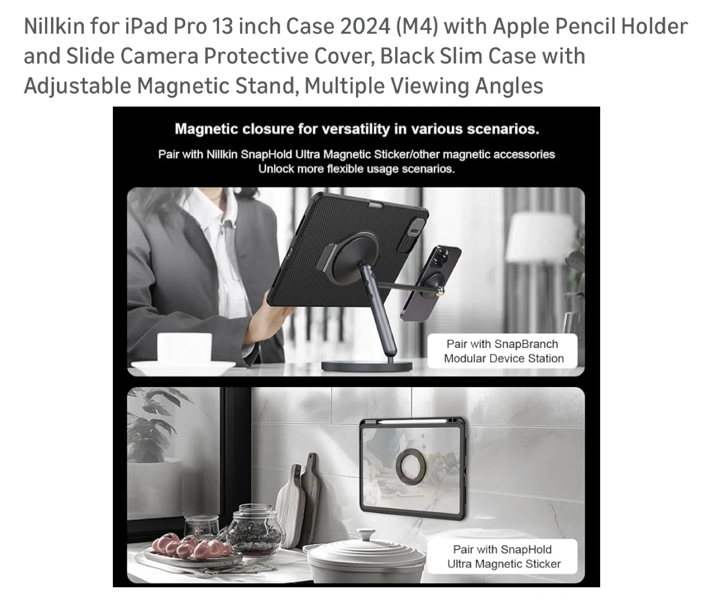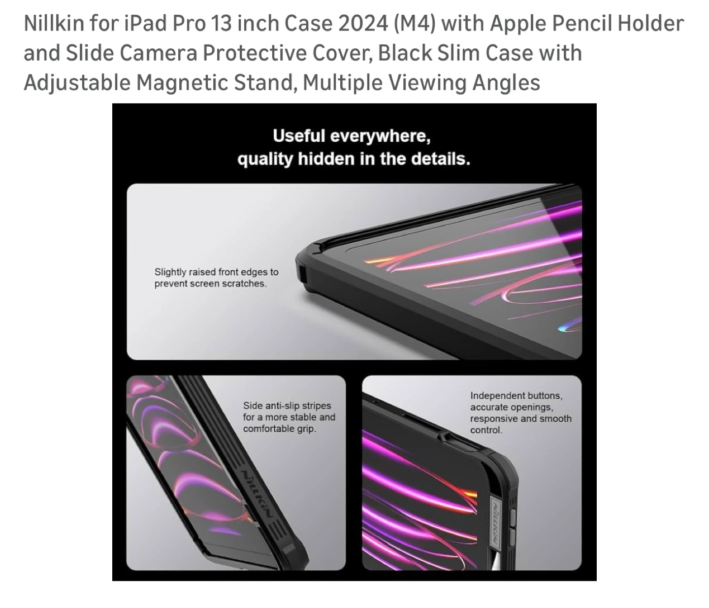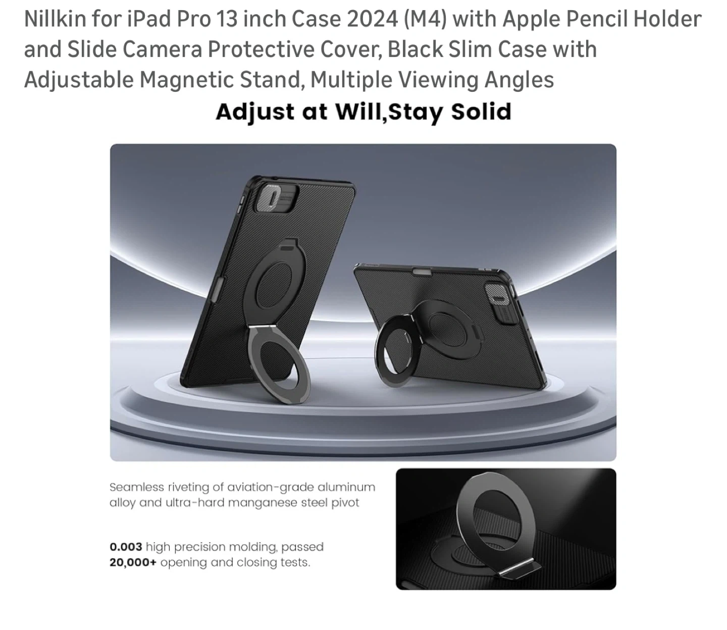 This is a Nillkin case for the 13-inch iPad Pro (2024 M4). It features an Apple Pencil holder and a slide camera protective cover. The case has an adjustable magnetic stand for multiple viewing angles and side anti-slip stripes for a better grip.