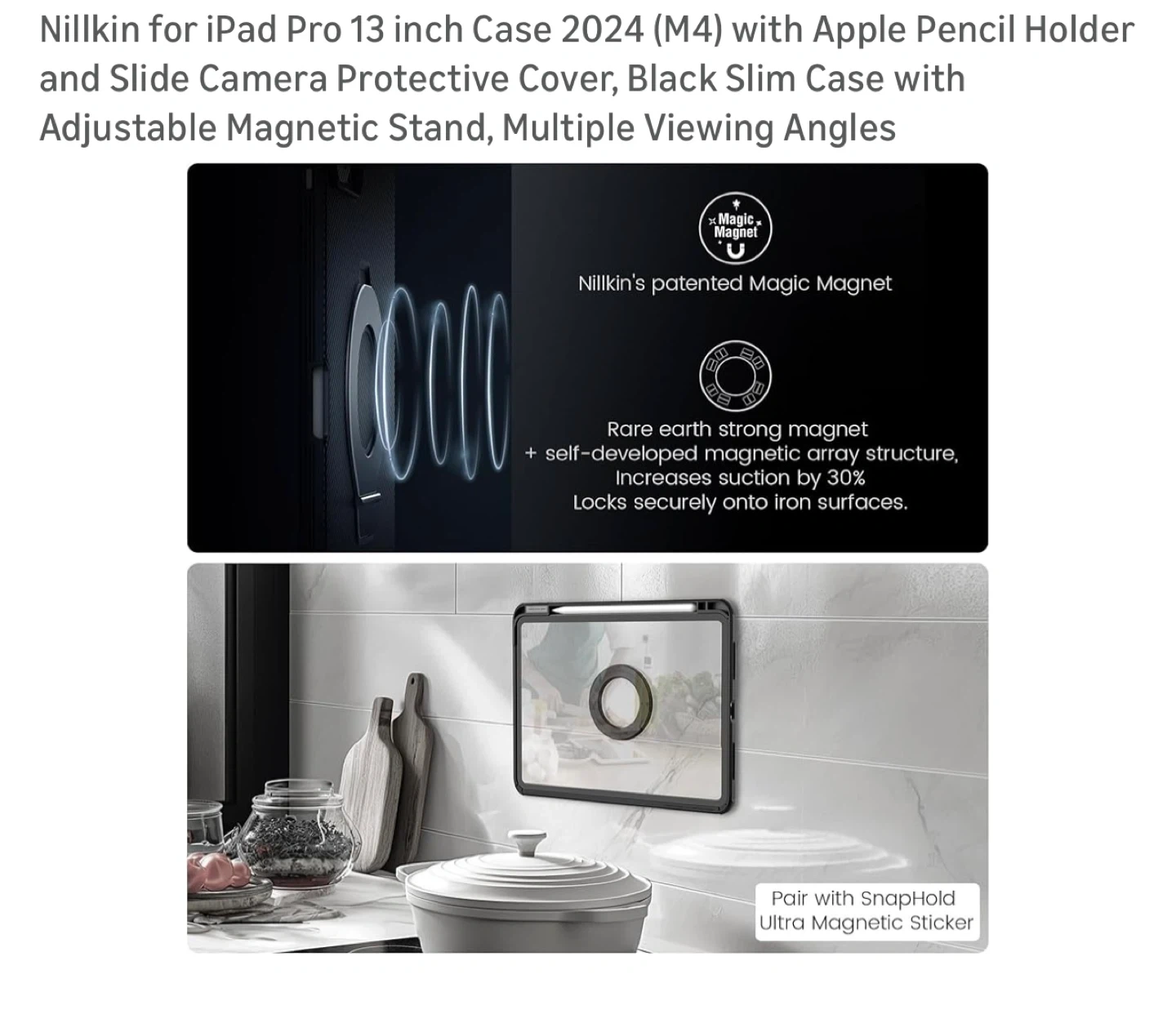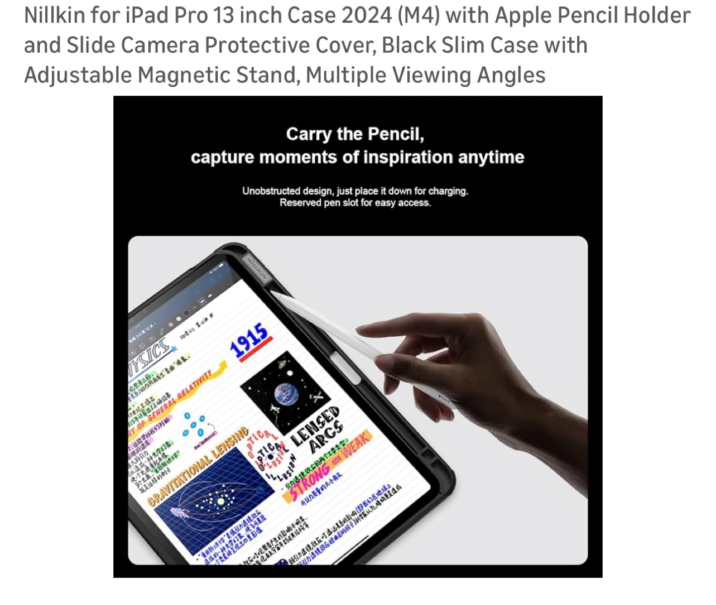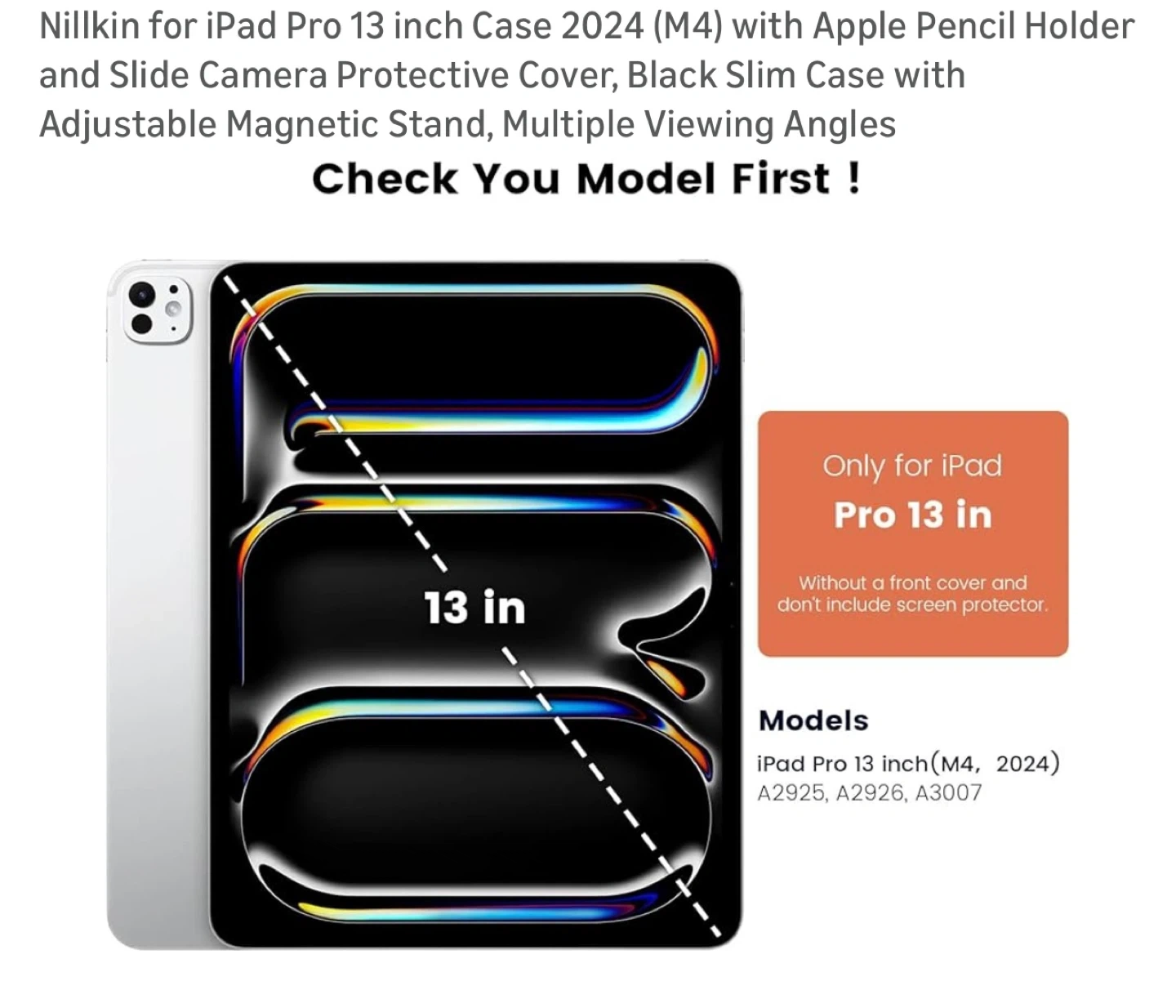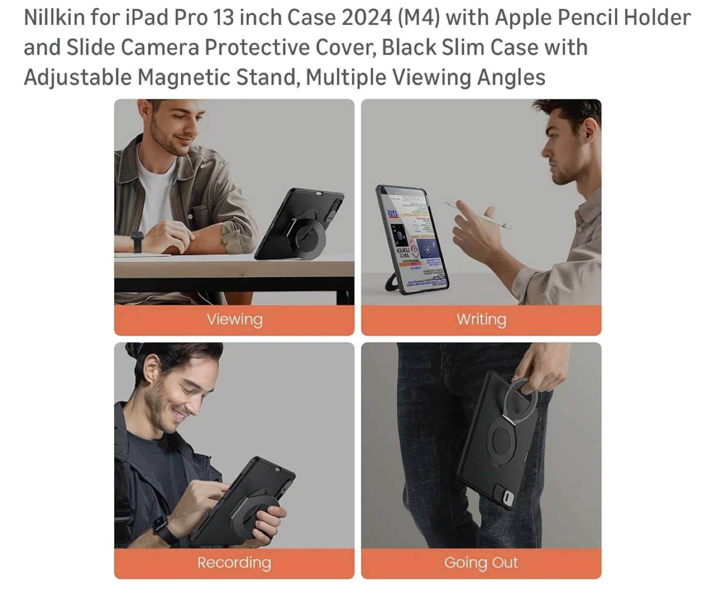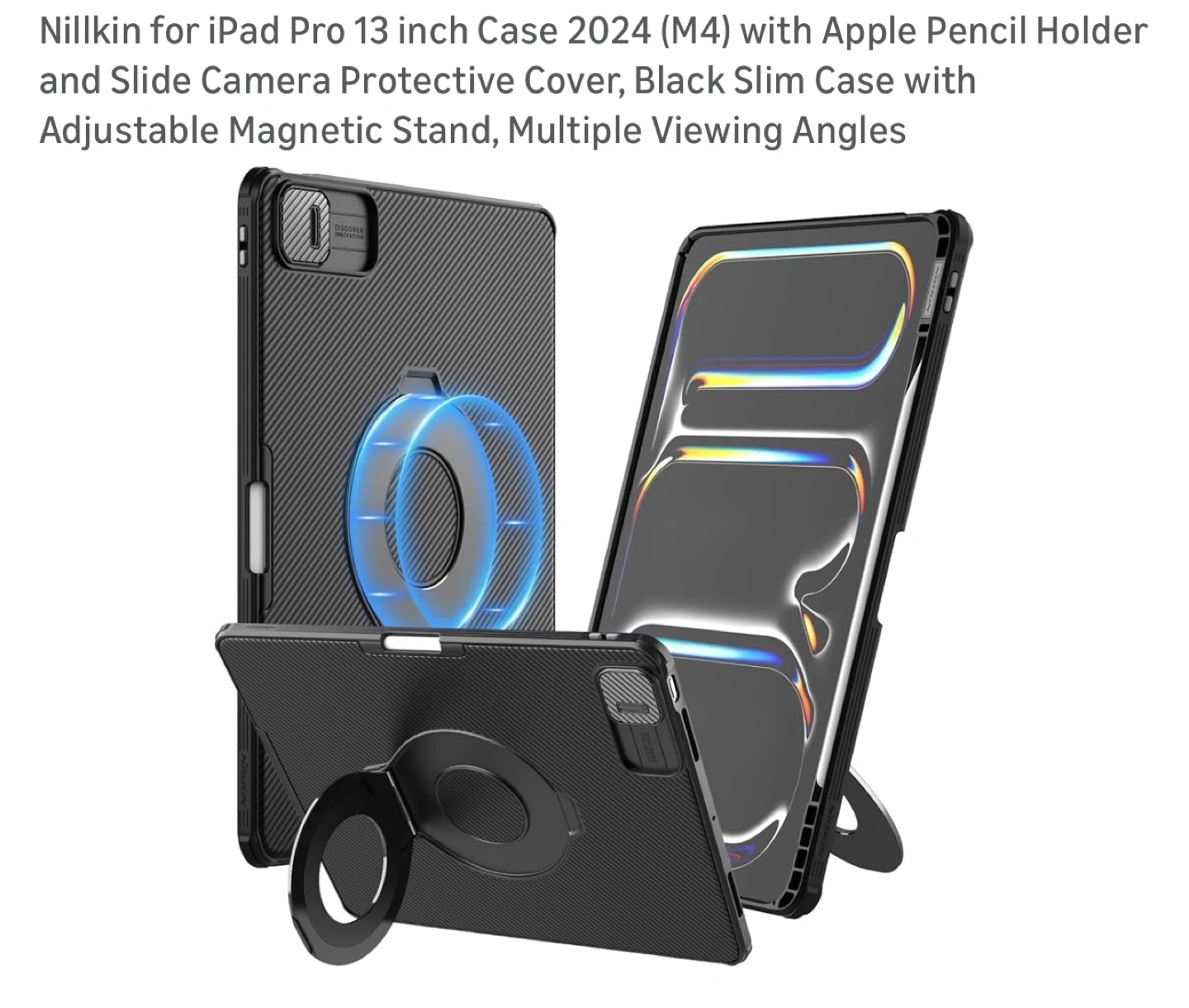 This is a Nillkin case for the 13-inch iPad Pro (2024 M4). It features an Apple Pencil holder and a slide camera protective cover. The case has an adjustable magnetic stand for multiple viewing angles and side anti-slip stripes for a better grip.
