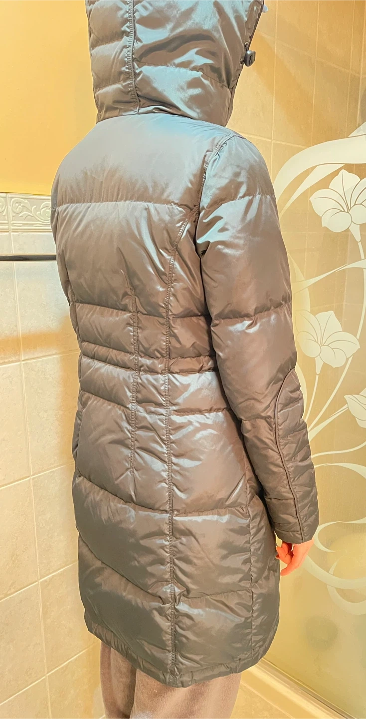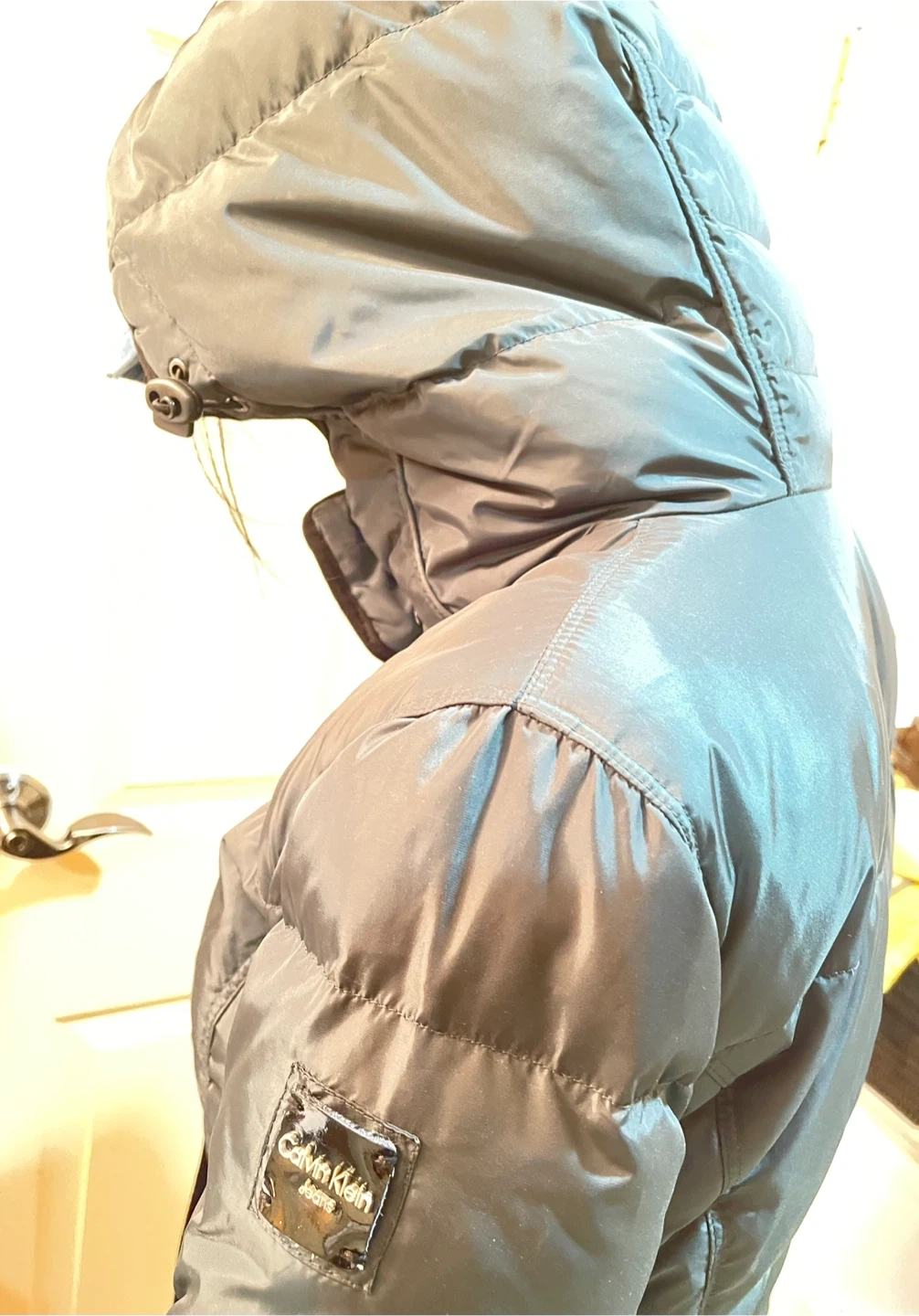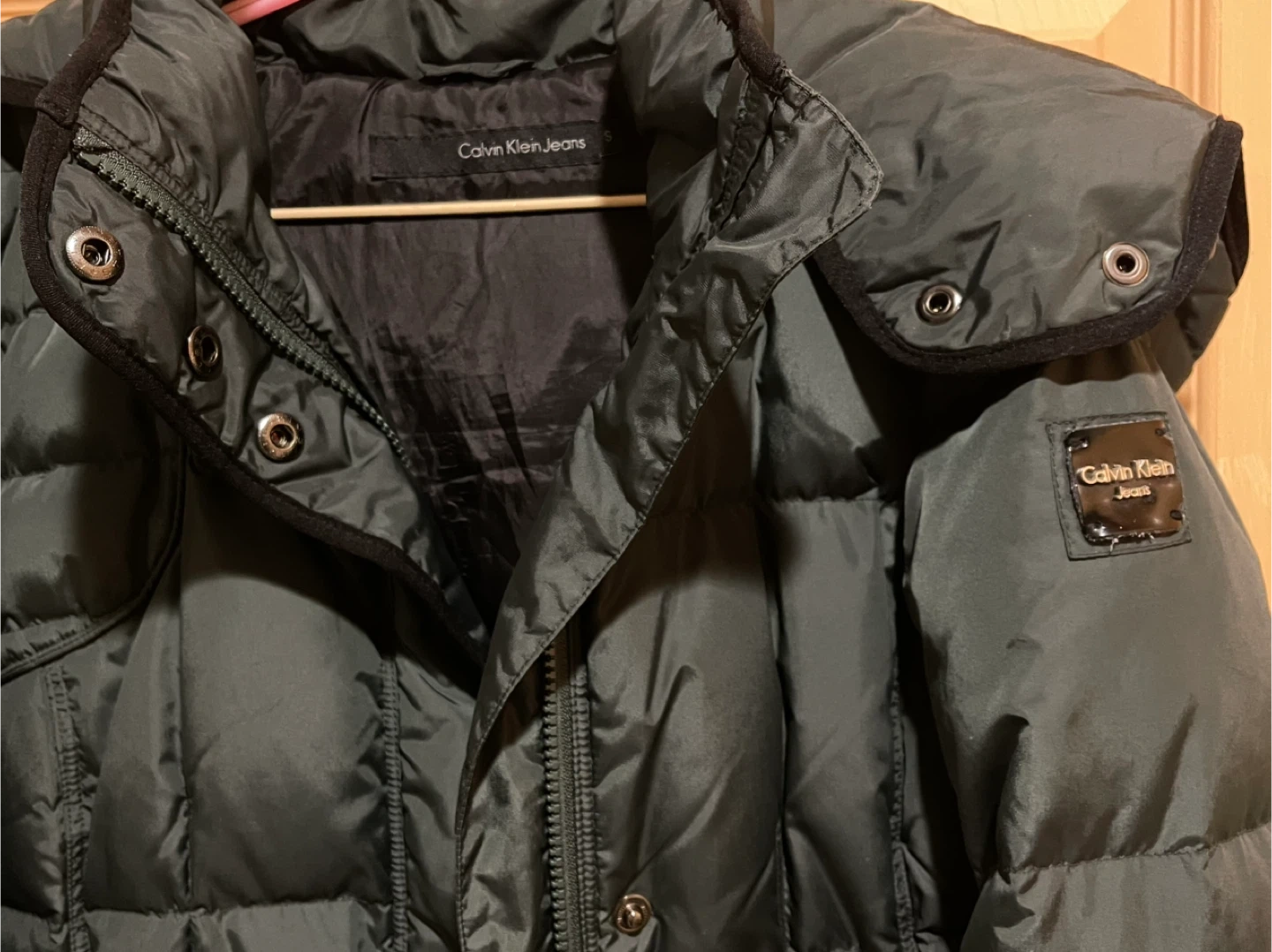 Calvin Klein Jeans puffer coat. It's a dark green, down-filled jacket with a hood. This coat offers excellent warmth for colder weather.
