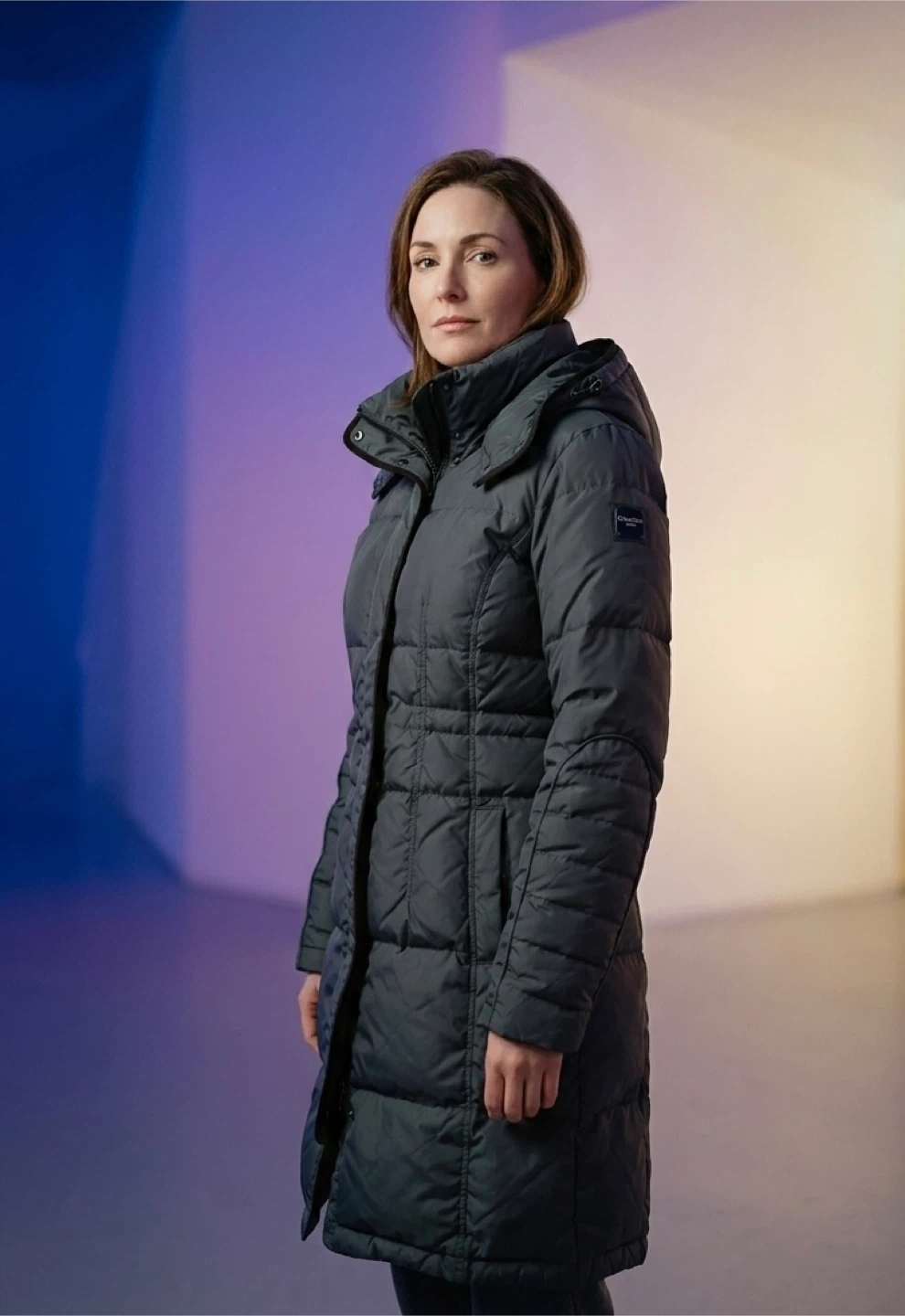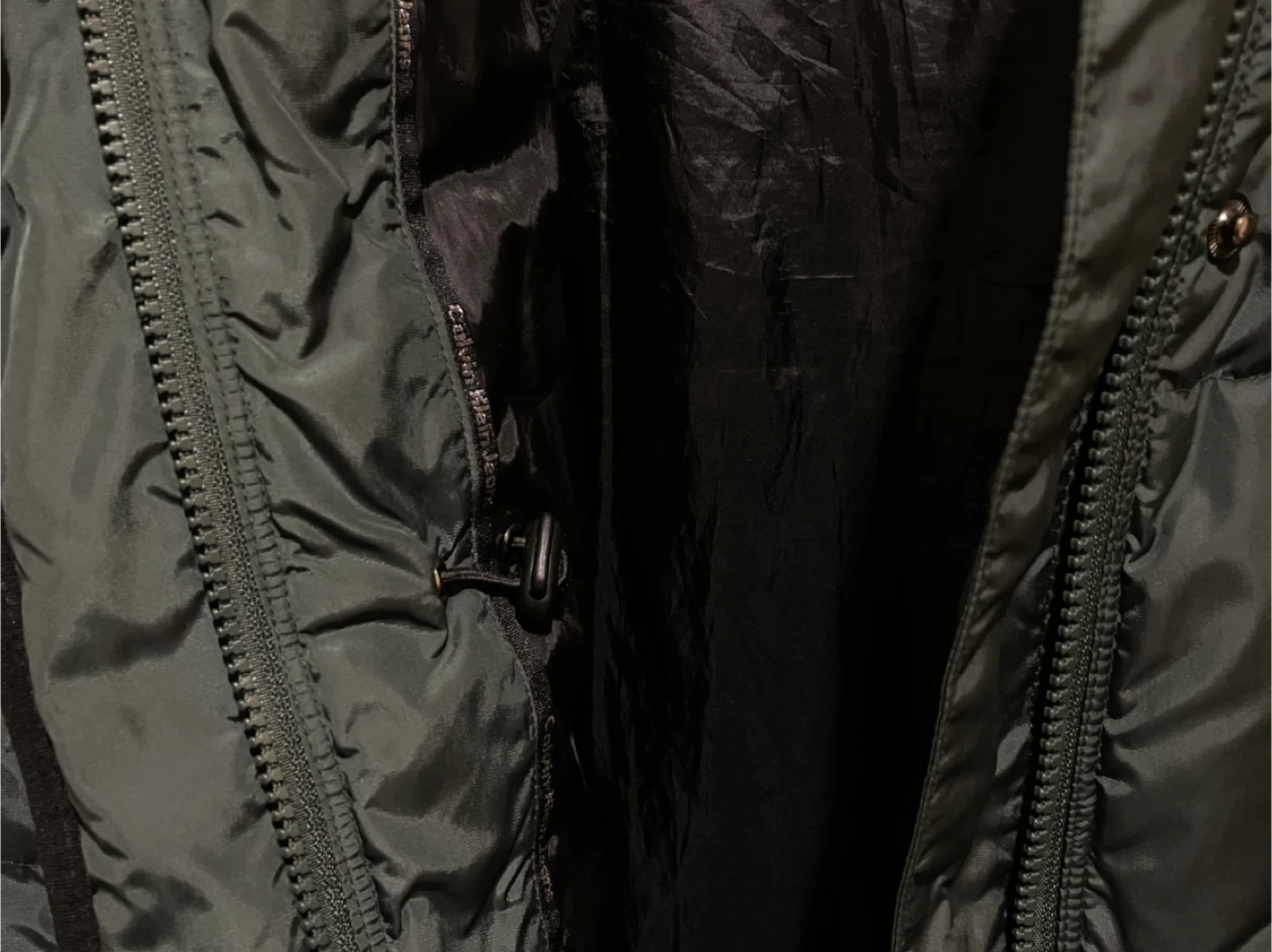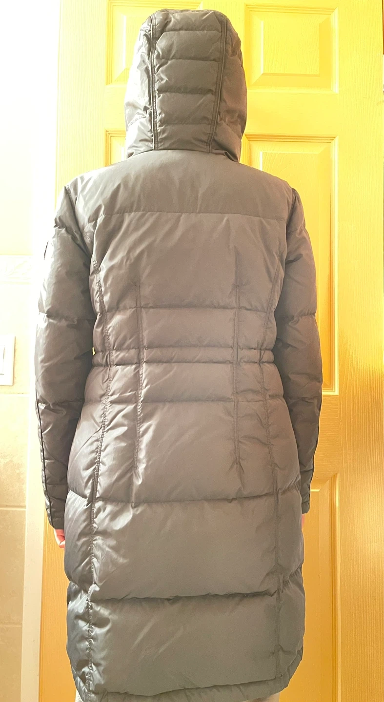 Calvin Klein Jeans puffer coat. It's a dark green, down-filled jacket with a hood. This coat offers excellent warmth for colder weather.