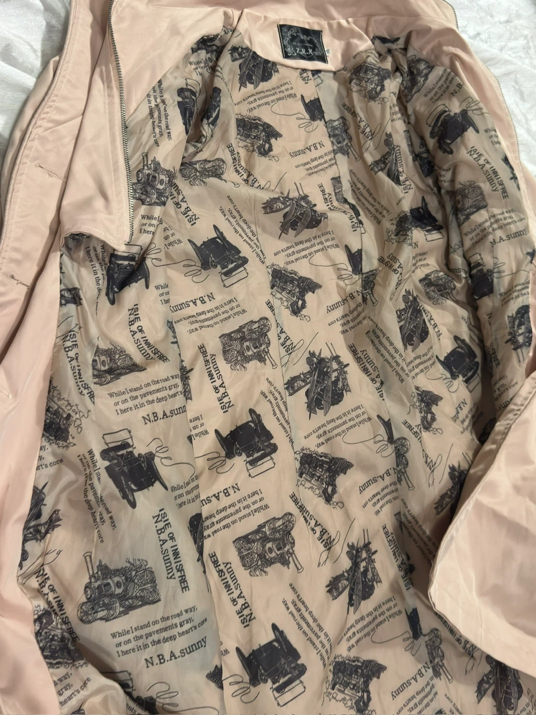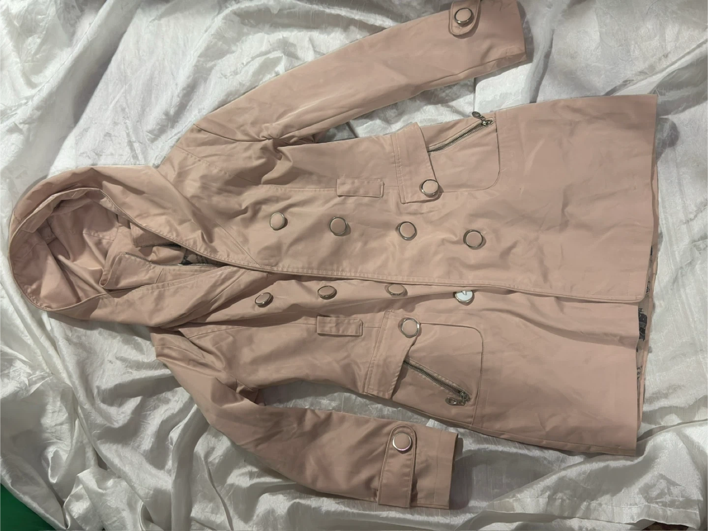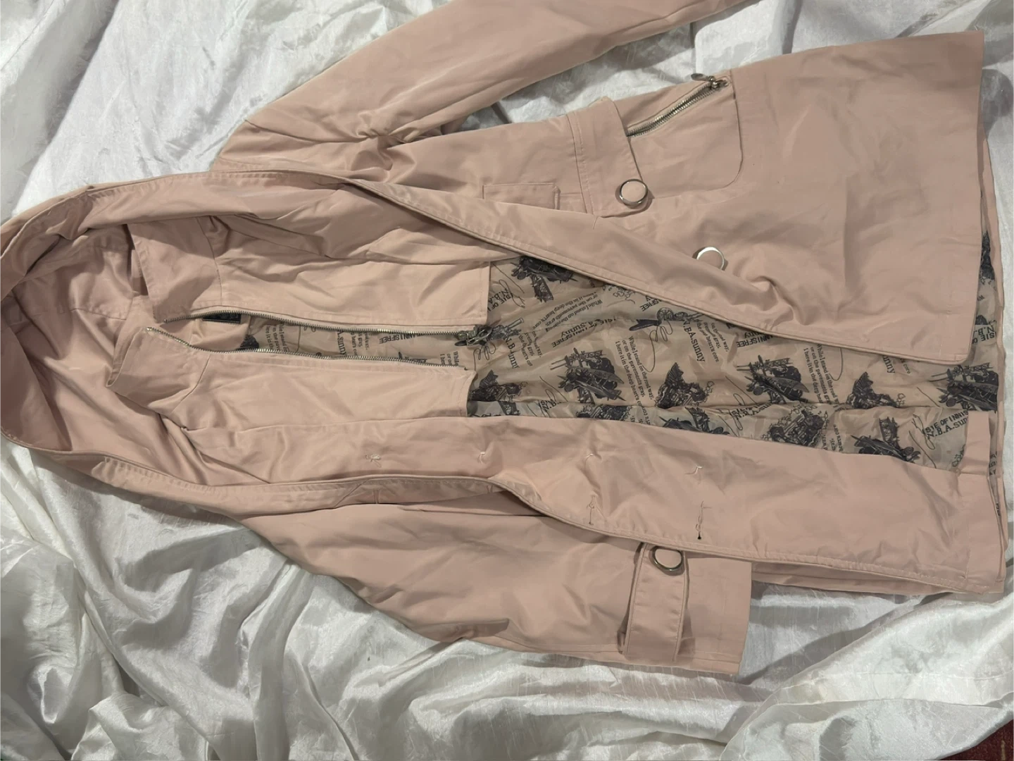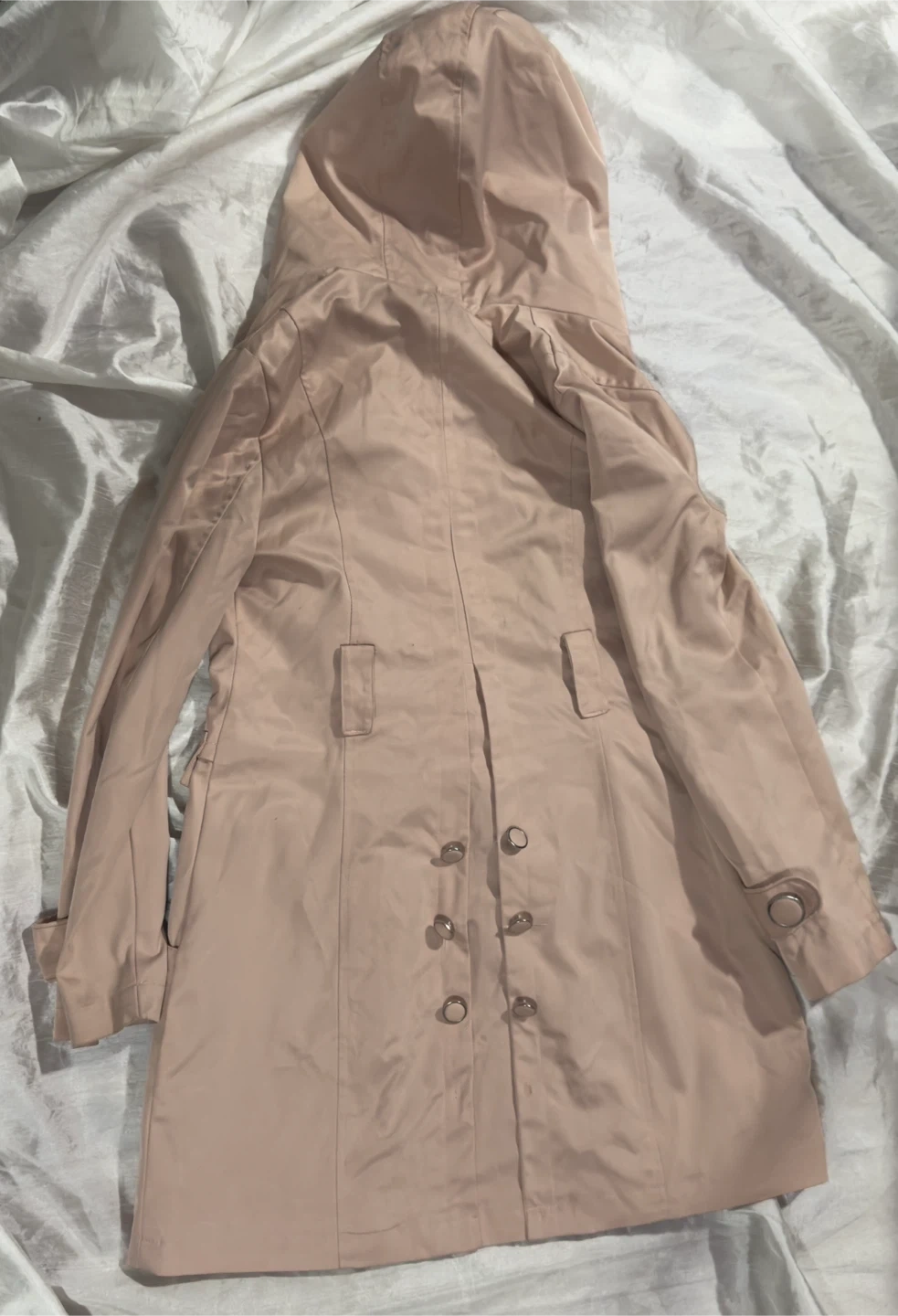 A stylish light pink hooded trench coat, perfect for those cooler days! It features a double-breasted button closure and a unique patterned lining. This coat is in great condition and ready for a new owner!