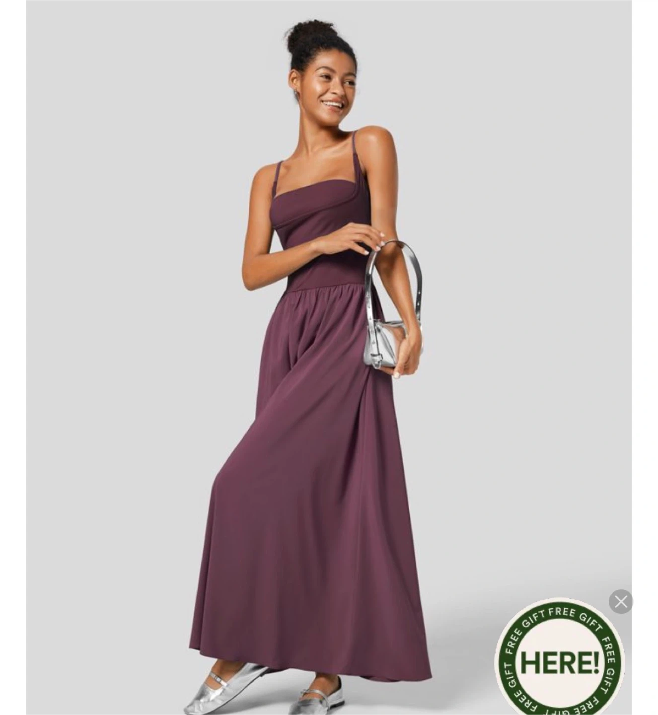 Breezeful Pocket Flowy Flare Maxi Dress in Amaranth colour. It's a quick-dry casual slip dress with a flowy, flare skirt. It has a fitted bodice with adjustable spaghetti straps. This dress is great for a casual outing or a summer day!