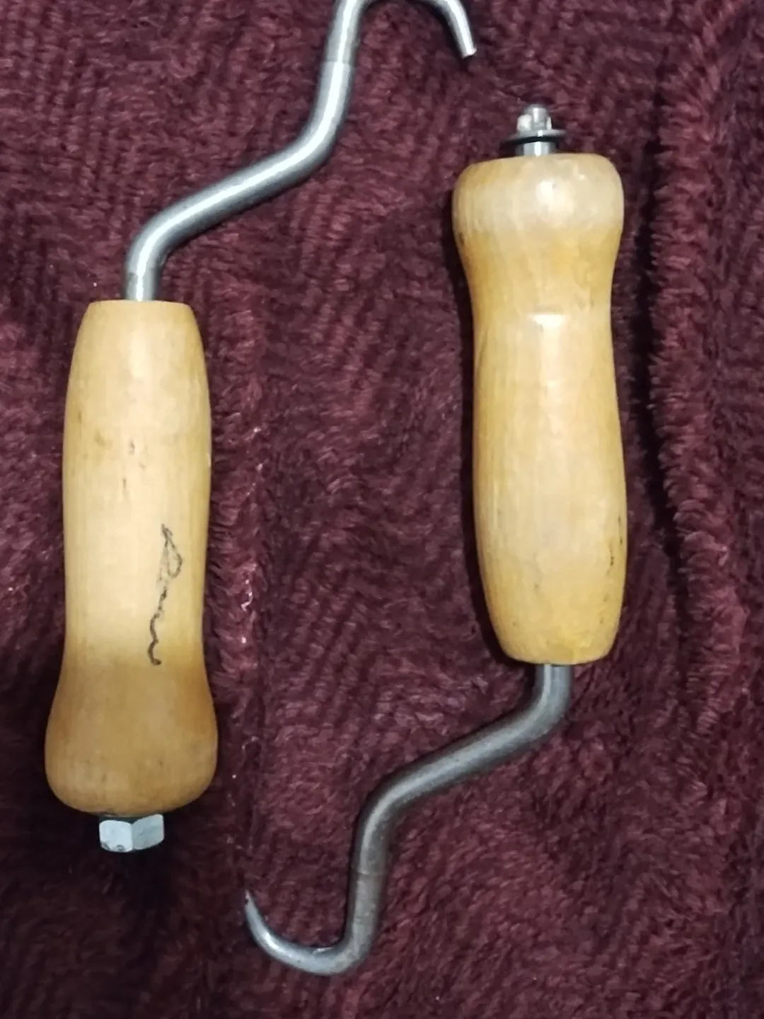 Selling a pair of metal hooks with wooden handles. They are in good condition and ready for use!