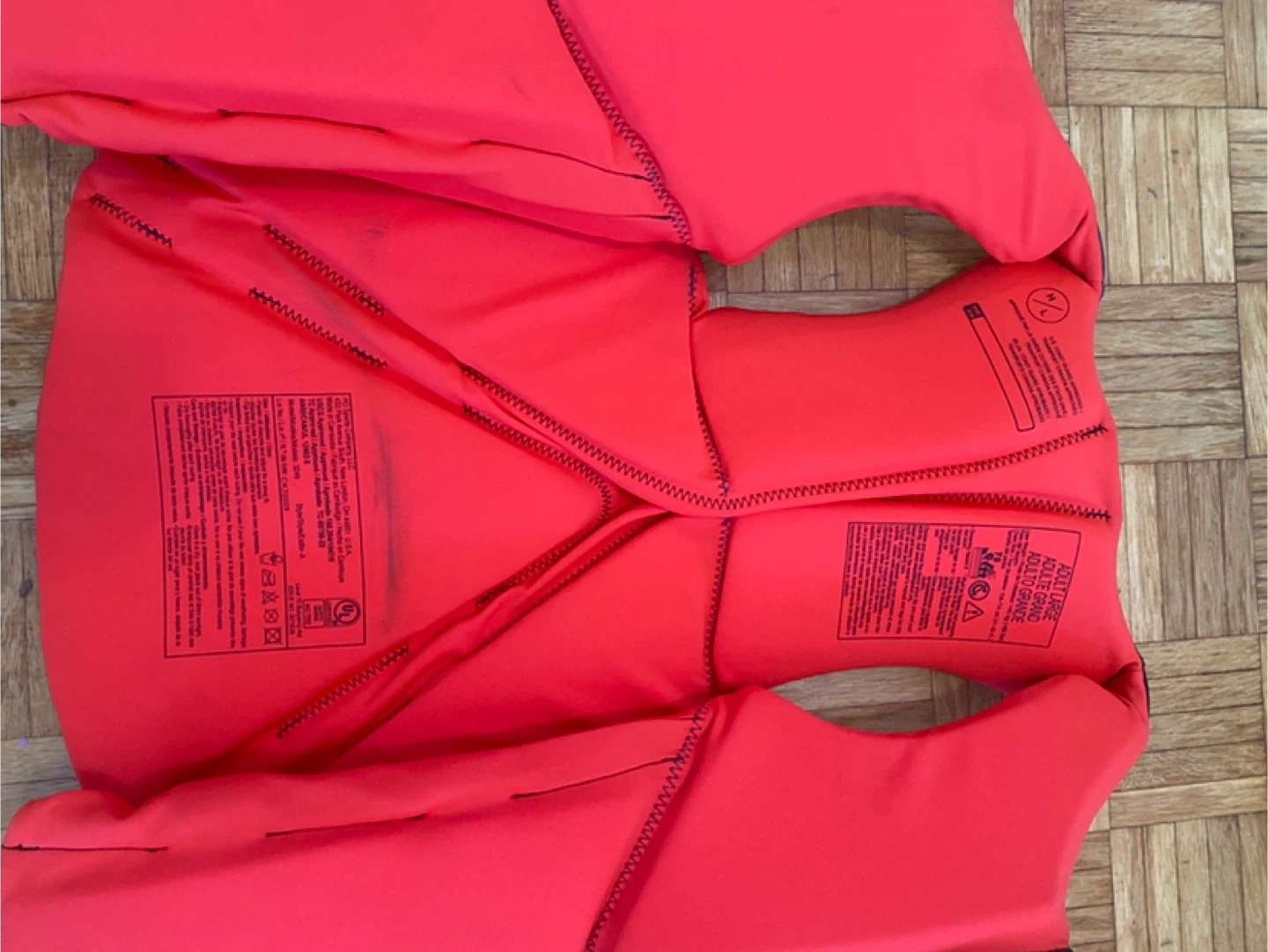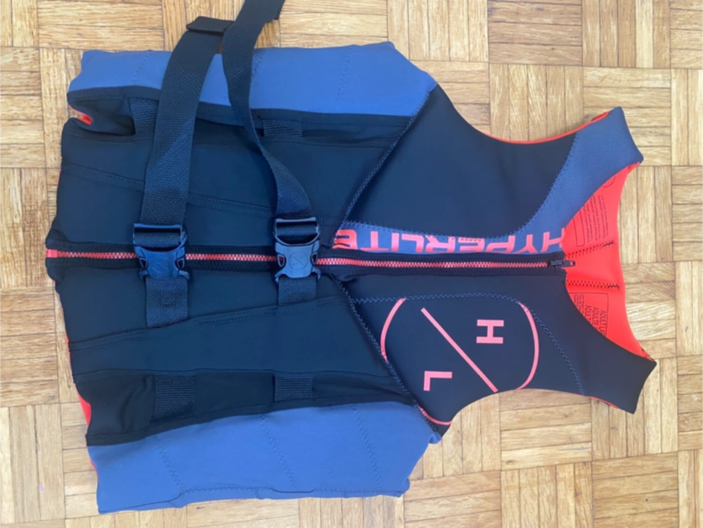 This is a Hyperlite wakeboard life jacket vest. It's designed for water sports with adjustable straps and buckles for a secure fit. The vest is red, black, and blue with a size L.