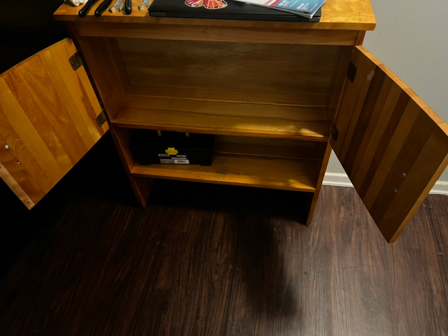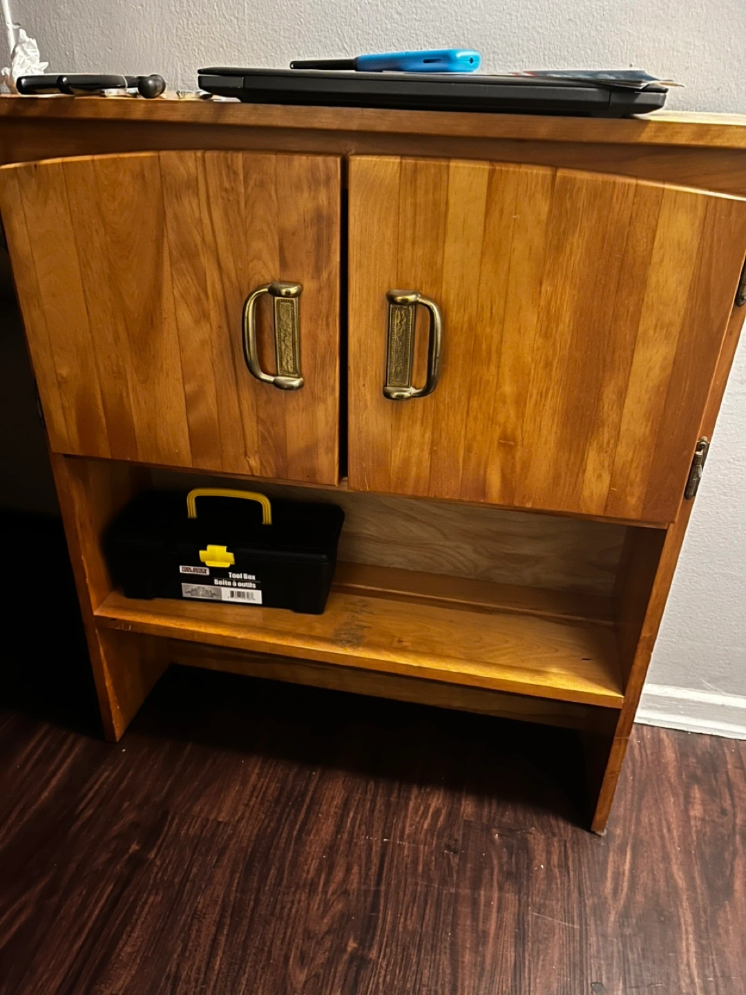 Add timeless charm and functionality to your space with this beautiful solid wood cabinet. Features include: • Two smooth-opening doors with vintage brass handles • Spacious interior shelf + open bottom shelf for extra storage • Perfect for tools, books, kitchen items, or décor • Sturdy and well-built with a warm wood finish
