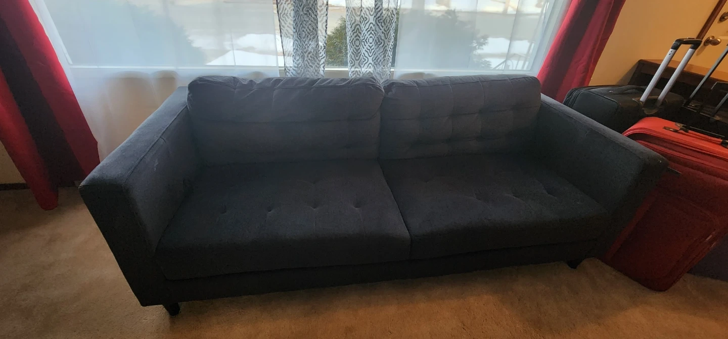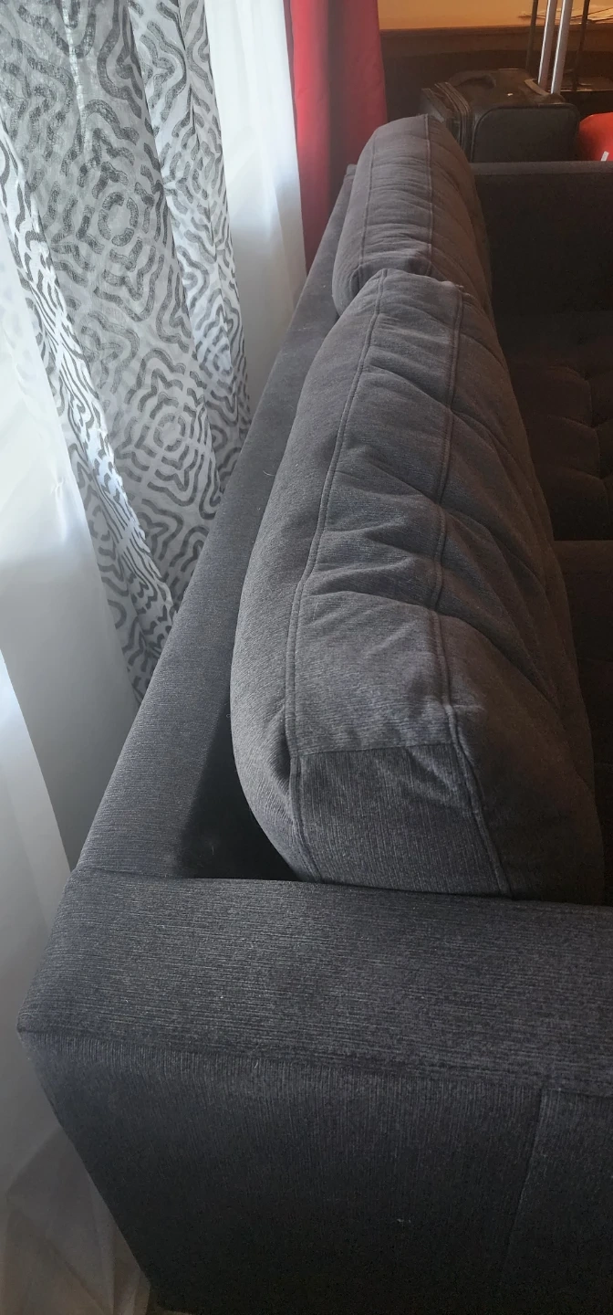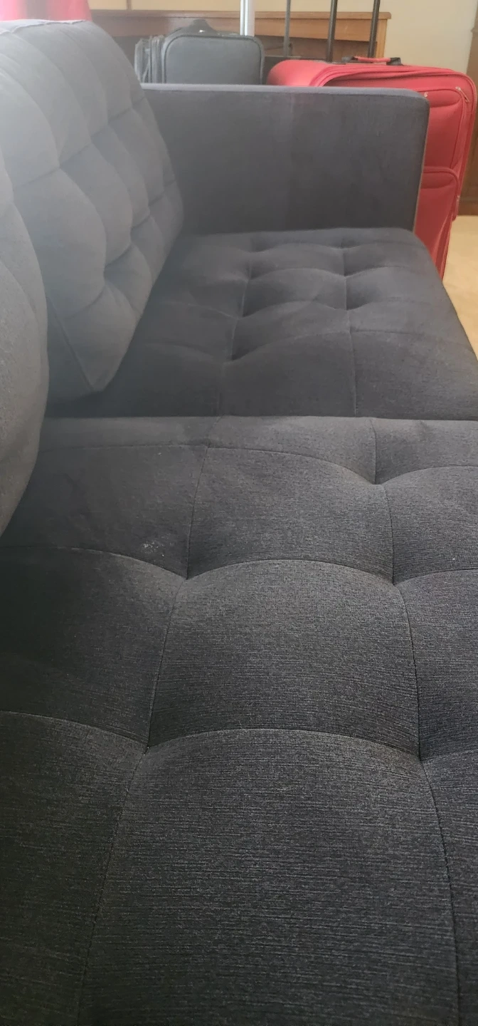 Dark grey fabric loveseat sofa with button tufting on the back cushions. It's a comfy spot for three. Material is fabric.