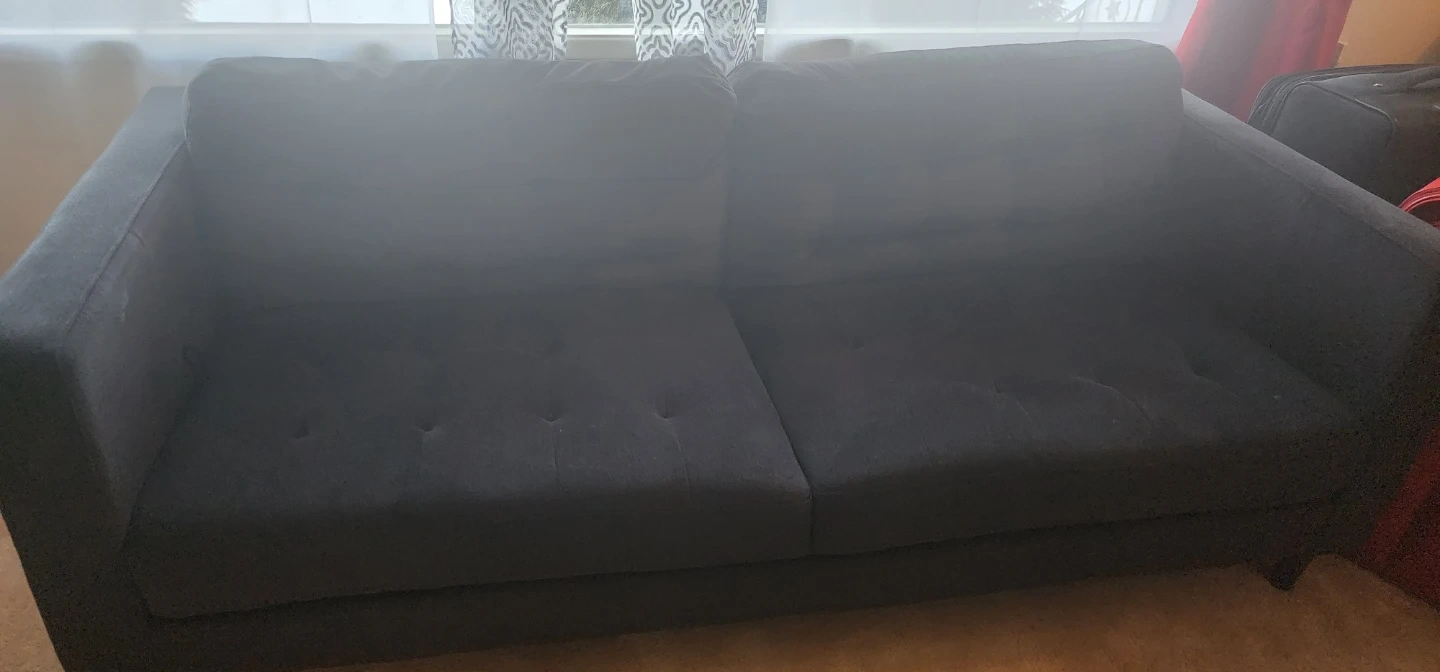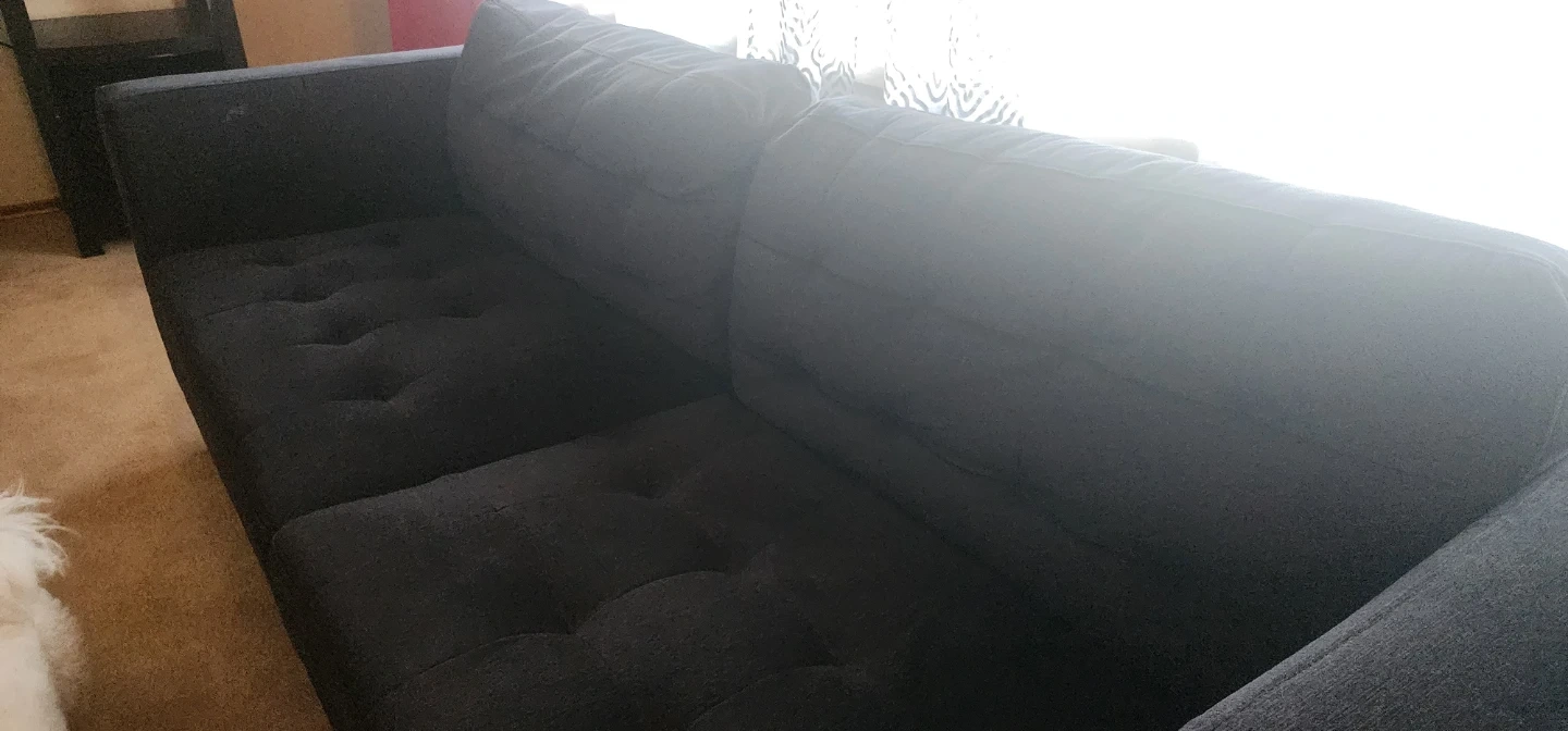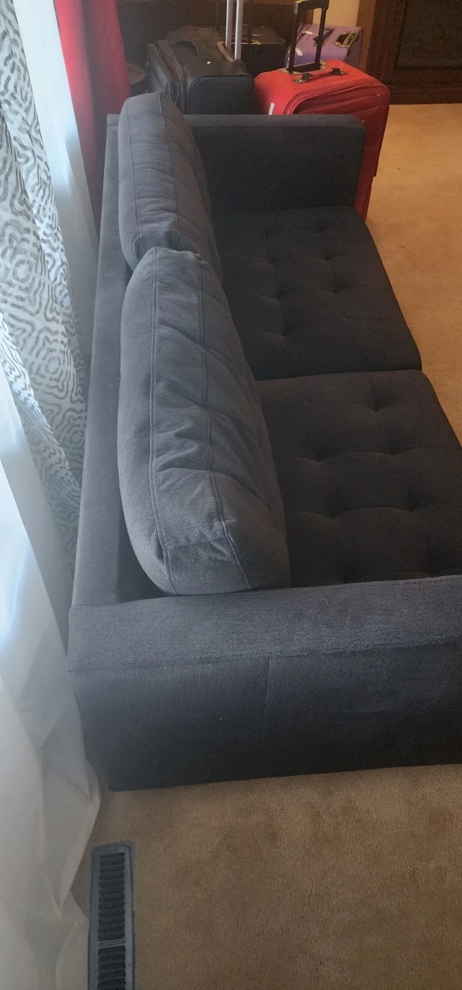Dark grey fabric loveseat sofa with button tufting on the back cushions. It's a comfy spot for three. Material is fabric.