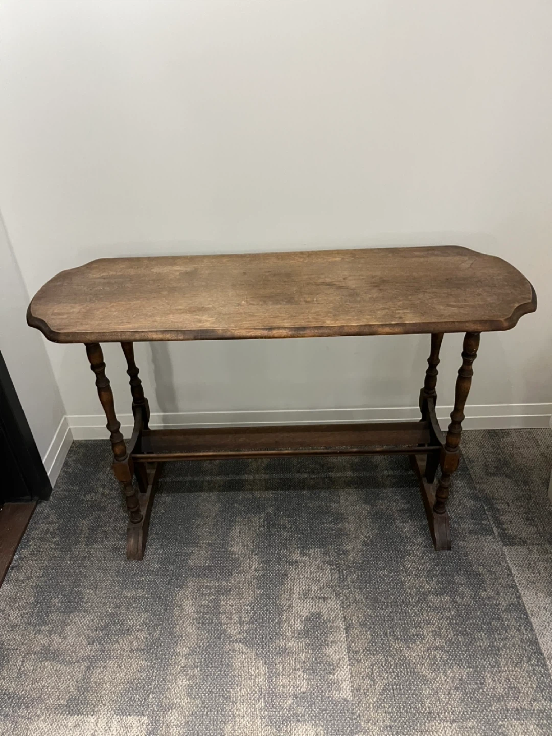 This is a lovely vintage hall table, crafted from solid wood. It features a single shelf below the tabletop for extra storage. This table would fit well in an entryway or as a decorative piece in any room.