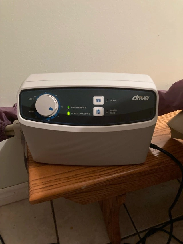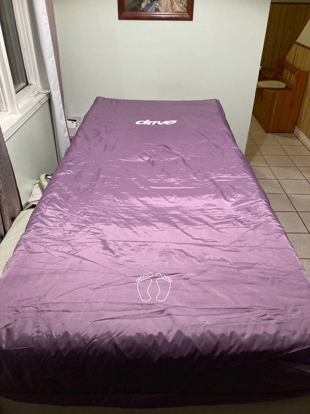 For sale is a like new Drive Med Aire 14027 low-air-loss pressure air mattress and customizable pump. This system provides alternating pressure and low air loss to help prevent and treat bedsores. The 20 individual air bladders can be adjusted for desired firmness via the pump. Dimensions are 36”x 80” with an 8” height. A fully electric adjustable bed with side rails is also available for an additional $300. Cash accepted. Owner selling.