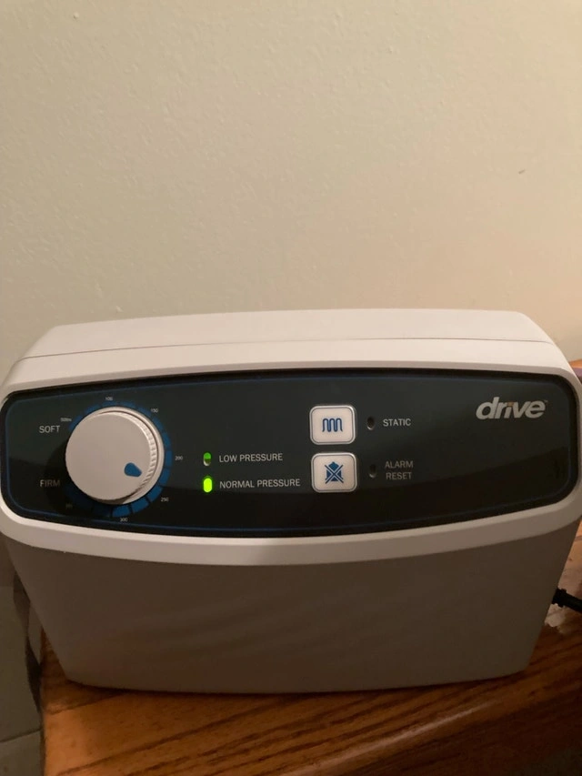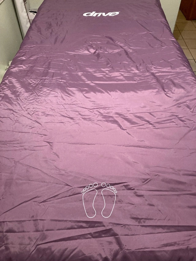 For sale is a like new Drive Med Aire 14027 low-air-loss pressure air mattress and customizable pump. This system provides alternating pressure and low air loss to help prevent and treat bedsores. The 20 individual air bladders can be adjusted for desired firmness via the pump. Dimensions are 36”x 80” with an 8” height. A fully electric adjustable bed with side rails is also available for an additional $300. Cash accepted. Owner selling.