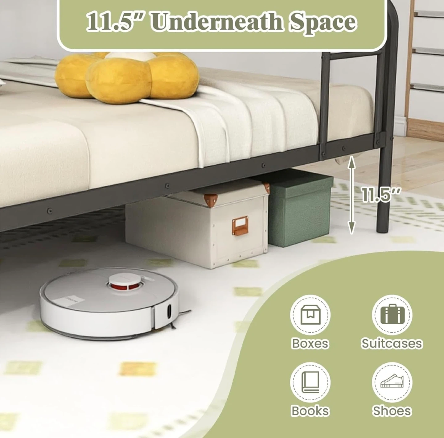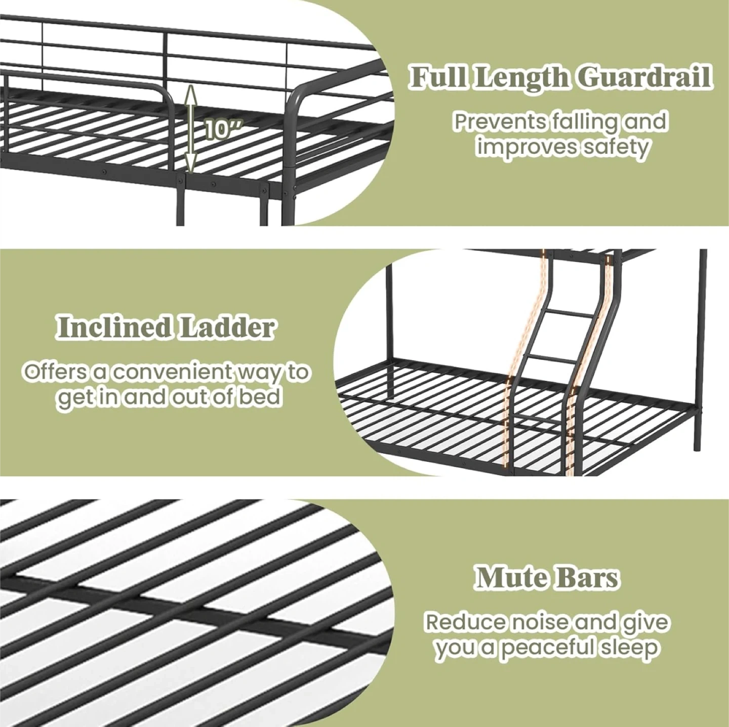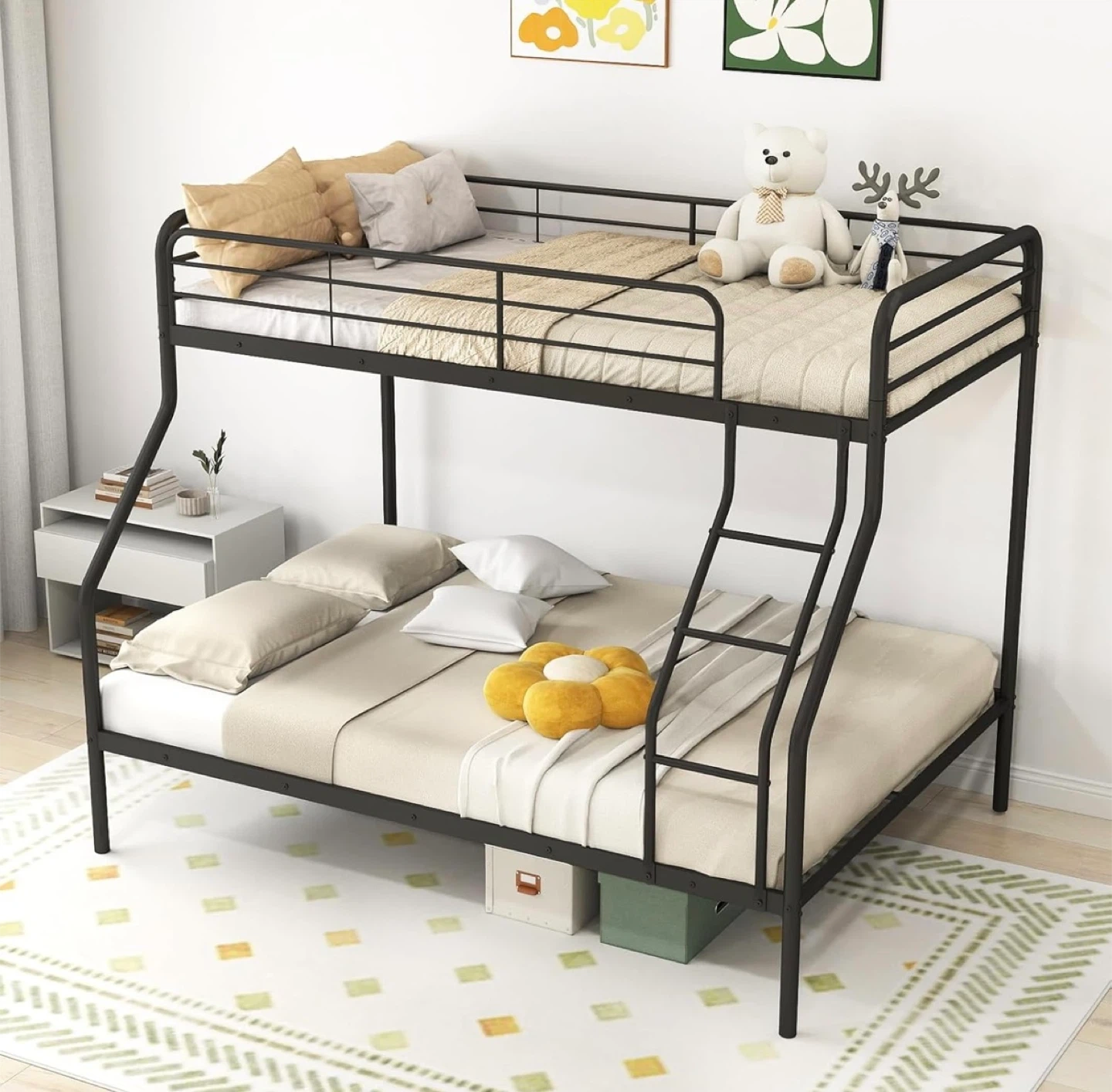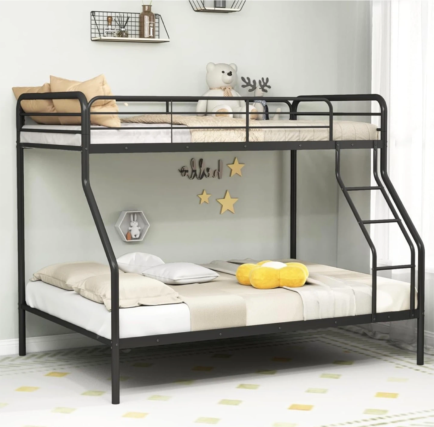 This black metal bunk bed offers a twin-sized upper bed and a full-sized lower bed. It’s perfect for storage underneath of it.