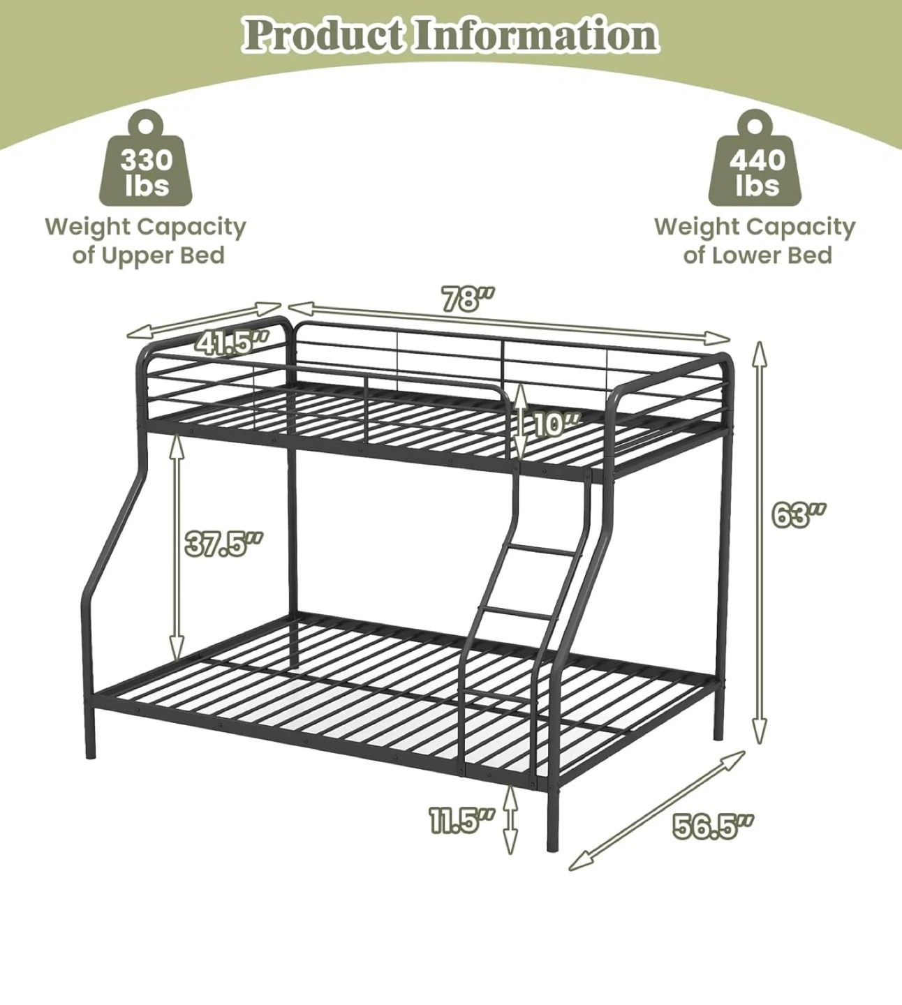 This black metal bunk bed offers a twin-sized upper bed and a full-sized lower bed. It’s perfect for storage underneath of it.