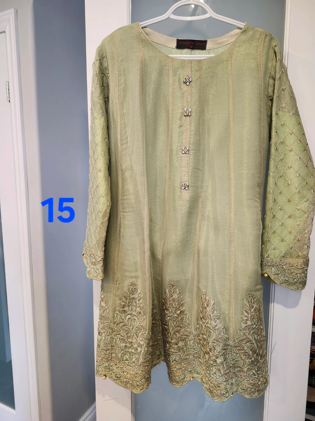 This is a Designer Touch women's kurti in a lovely light green shade. It features intricate gold embroidery along the hem and sleeves, with decorative buttons down the front. The fabric has a subtle sheen and a comfortable fit. Size medium.
