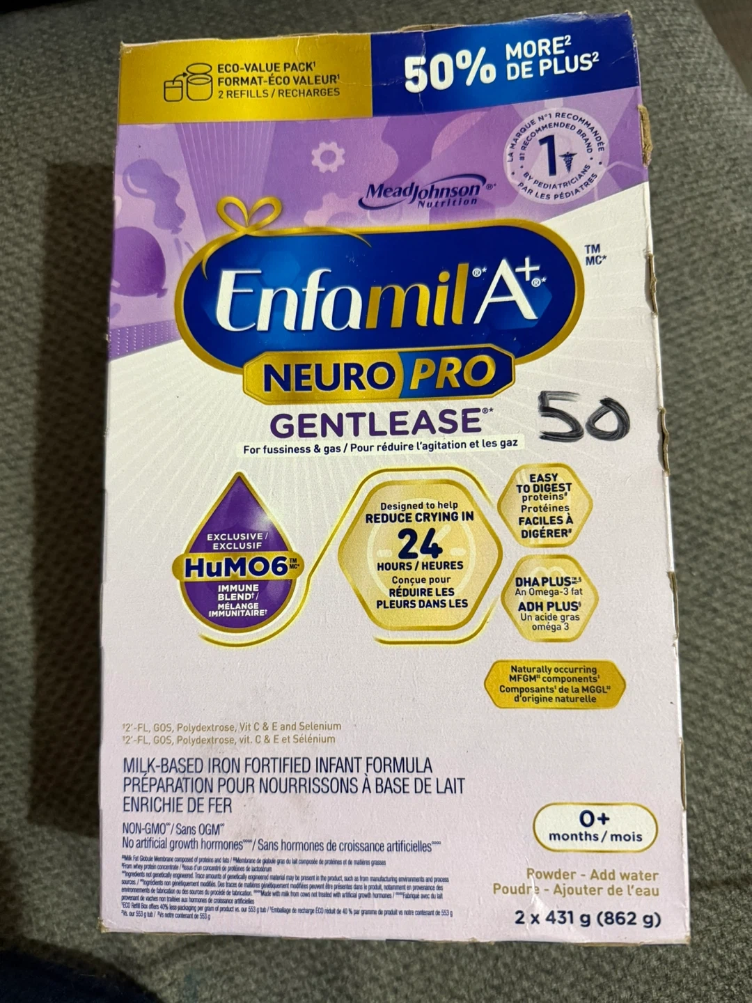This is Enfamil A+ Neuro Pro Gentlease infant formula. It's designed to help reduce fussiness and gas. Includes 2 cans, each 862g.