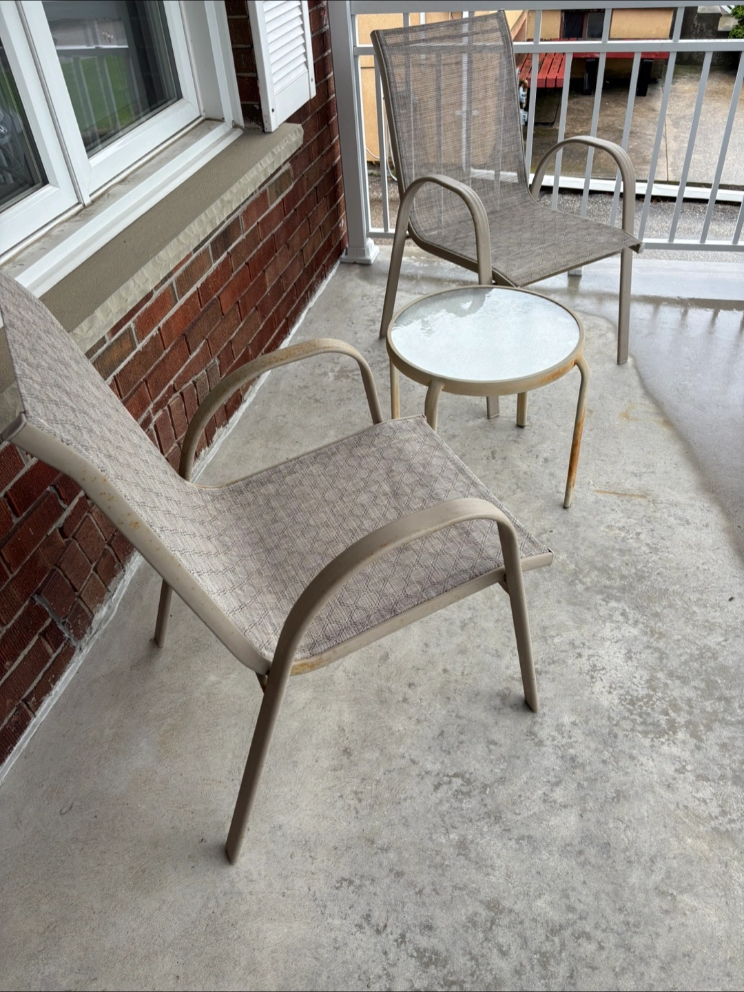 4 metal lawn balcony chairs with small glass table.