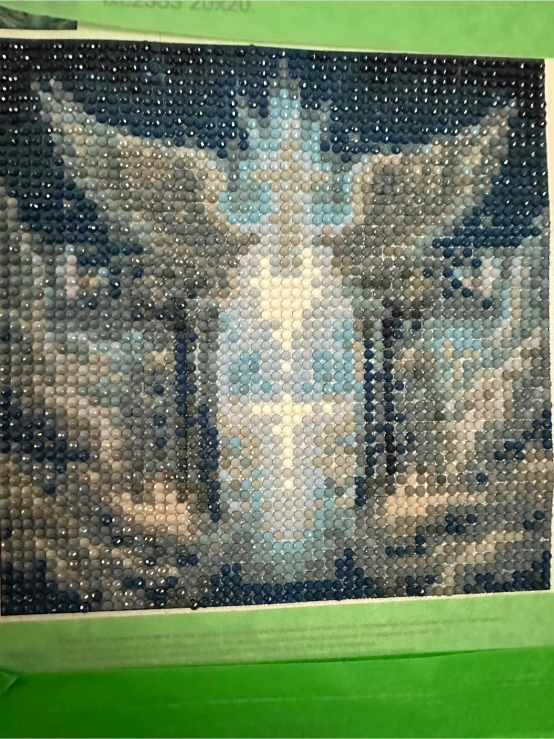 Here's a diamond art painting that's all finished and ready to go! It features a cool design with shades of blue, grey and white. It's a fun piece to add a bit of sparkle to your space