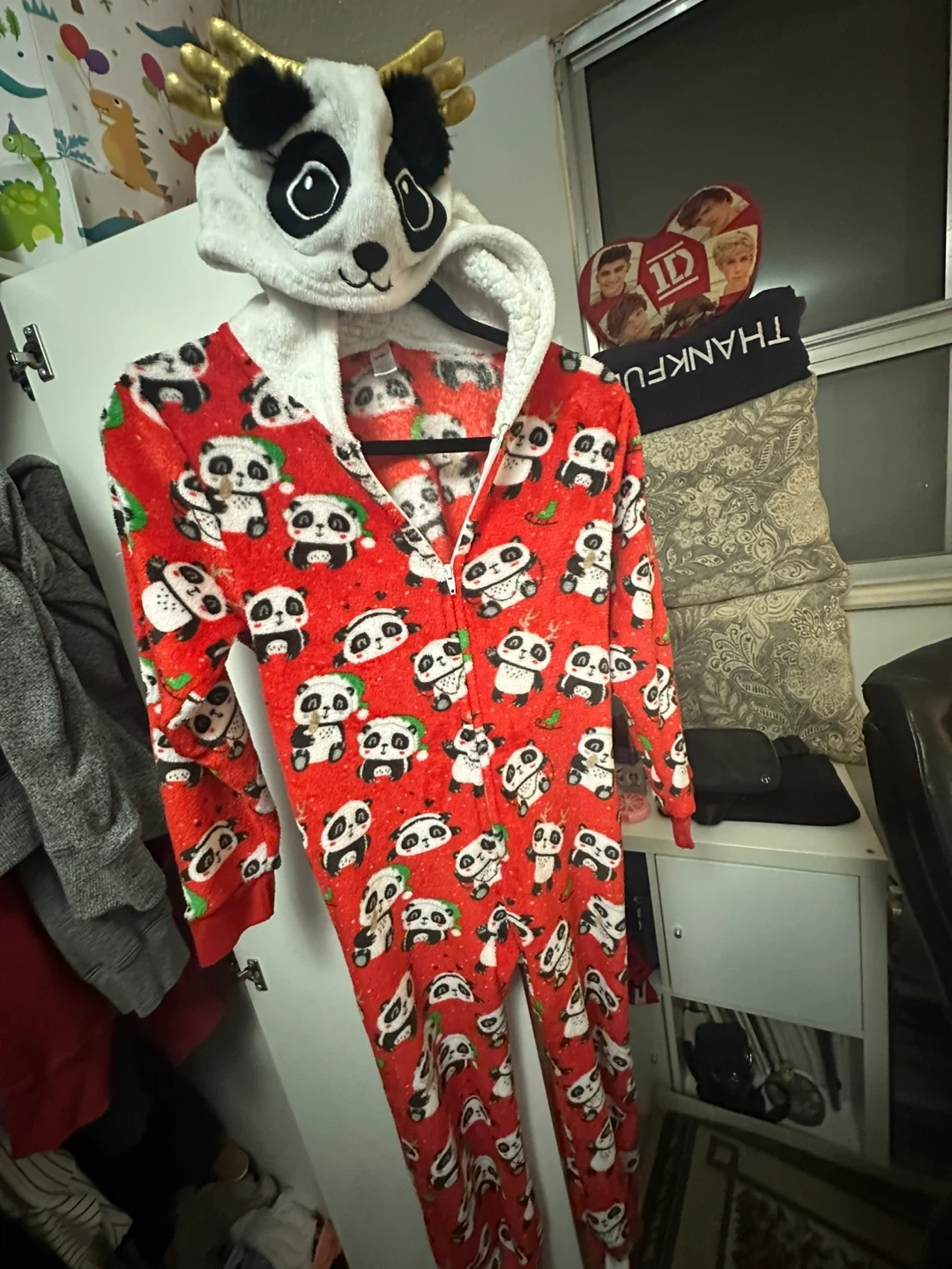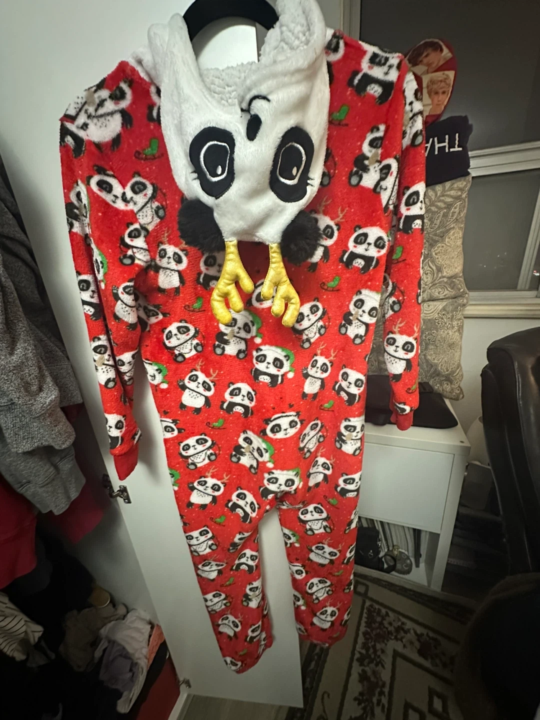 Cozy red fleece onesie with a fun all-over panda print. It features a hood with a panda face and fluffy ears. Made from 100% polyester for ultimate comfort. Perfect for lounging or sleeping!