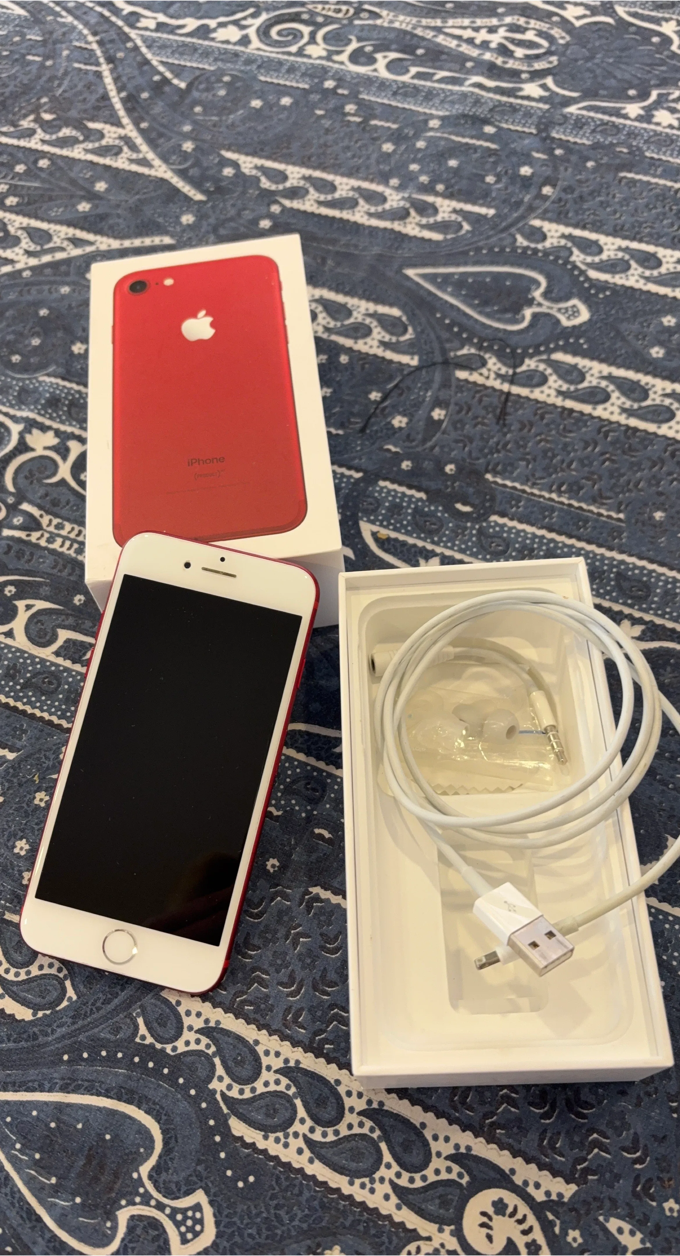 This is an Apple iPhone 7 128GB(PRODUCT)RED. It comes with the original box and EarPods with Lightning Connector. Includes USB cable too.