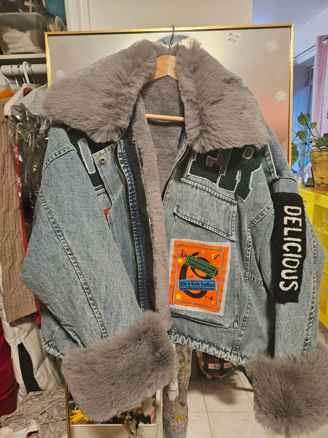 Stylish denim jacket featuring a removable faux fur collar and cuffs. It's lined for extra warmth and has a zip-up front closure. Unique patches and "DELICIOUS" text detail on the sleeve add a touch of personality. A cool outerwear piece for any season!
