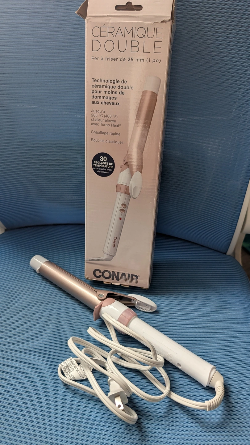 Selling a Conair Double Ceramic High Heat Curling Iron in great condition! It heats up quickly and has multiple heat settings for different hair types. The ceramic technology helps reduce damage and frizz, leaving your hair smooth and shiny. Originally bought for $34.99, it comes with the original box