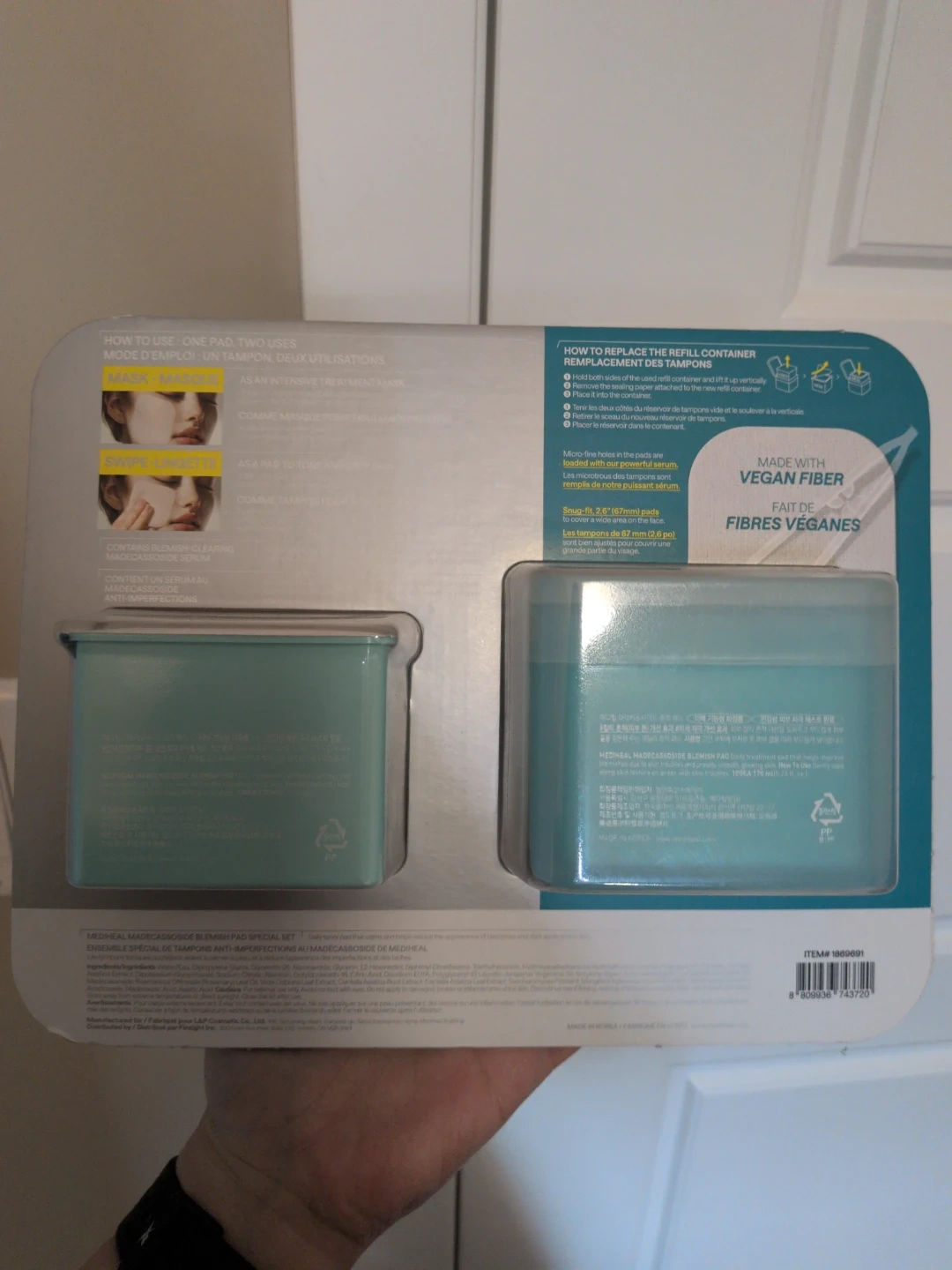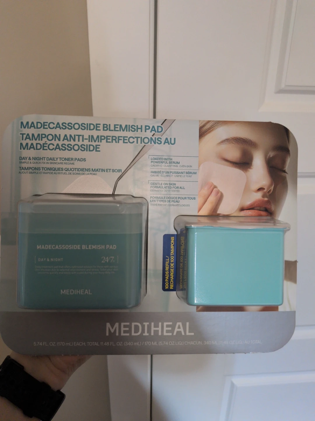 This set includes Madecassoside Blemish Pads and a refill. The pads are loaded with a powerful serum for blemish care. They're made with vegan fiber and gentle on skin. Never opened.