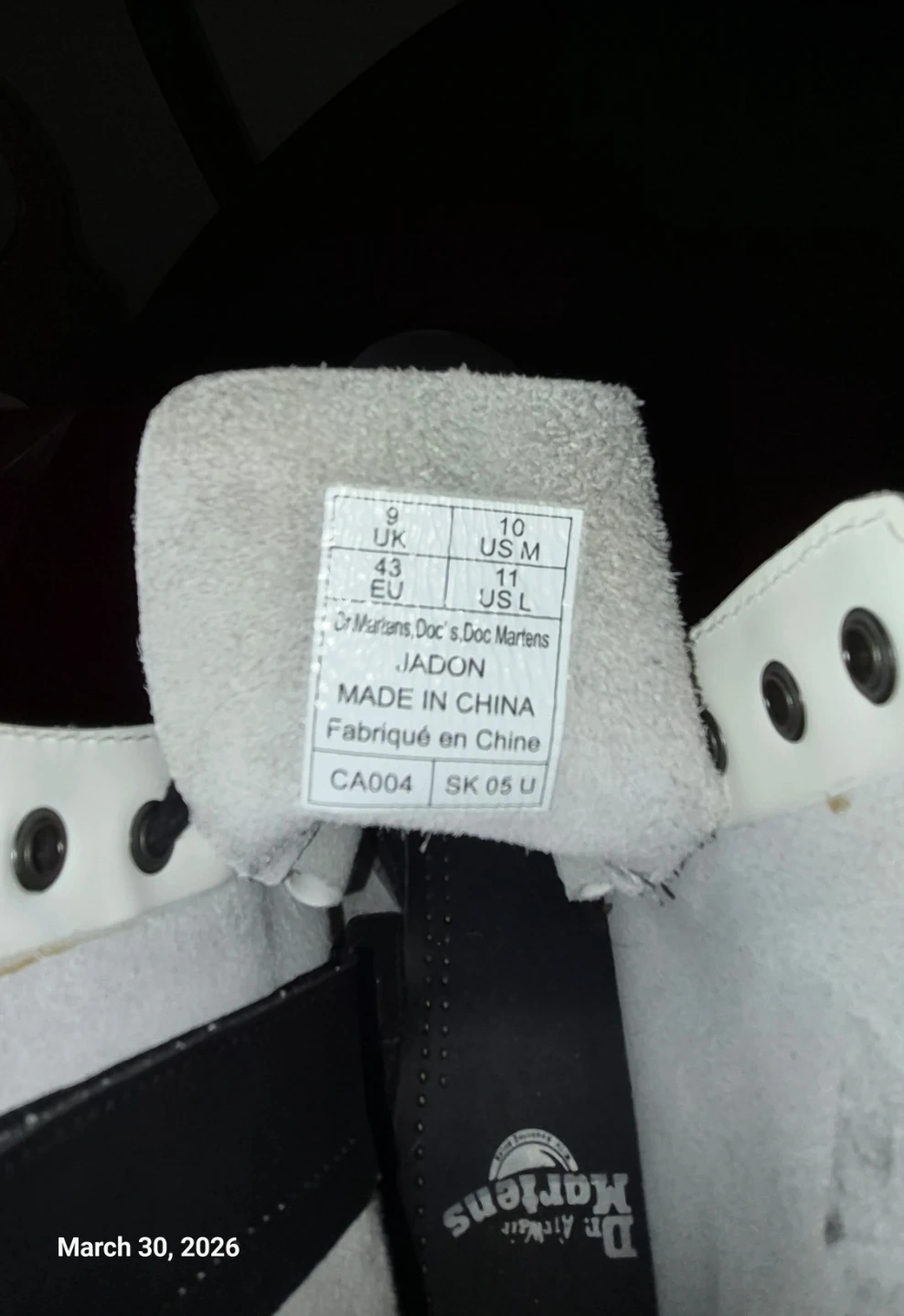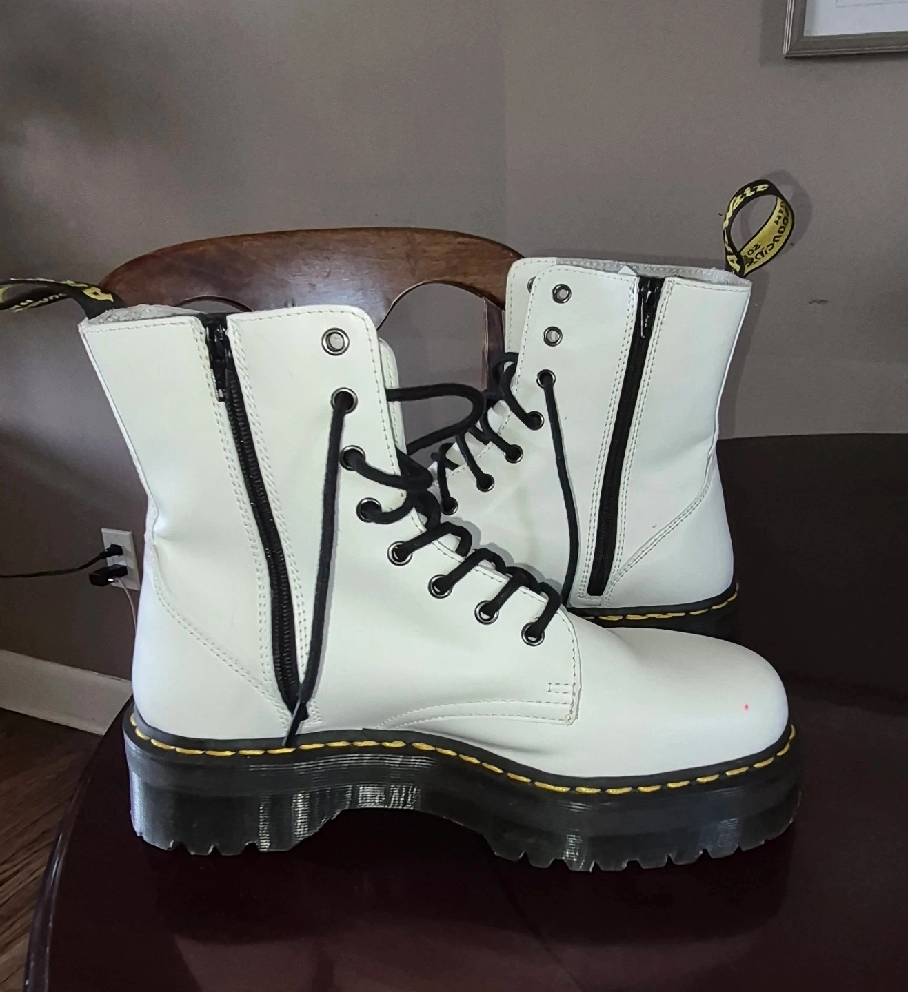 đ„Dr. Martens Jadon white platform boots featuring zippers on the sides for easy on and off.