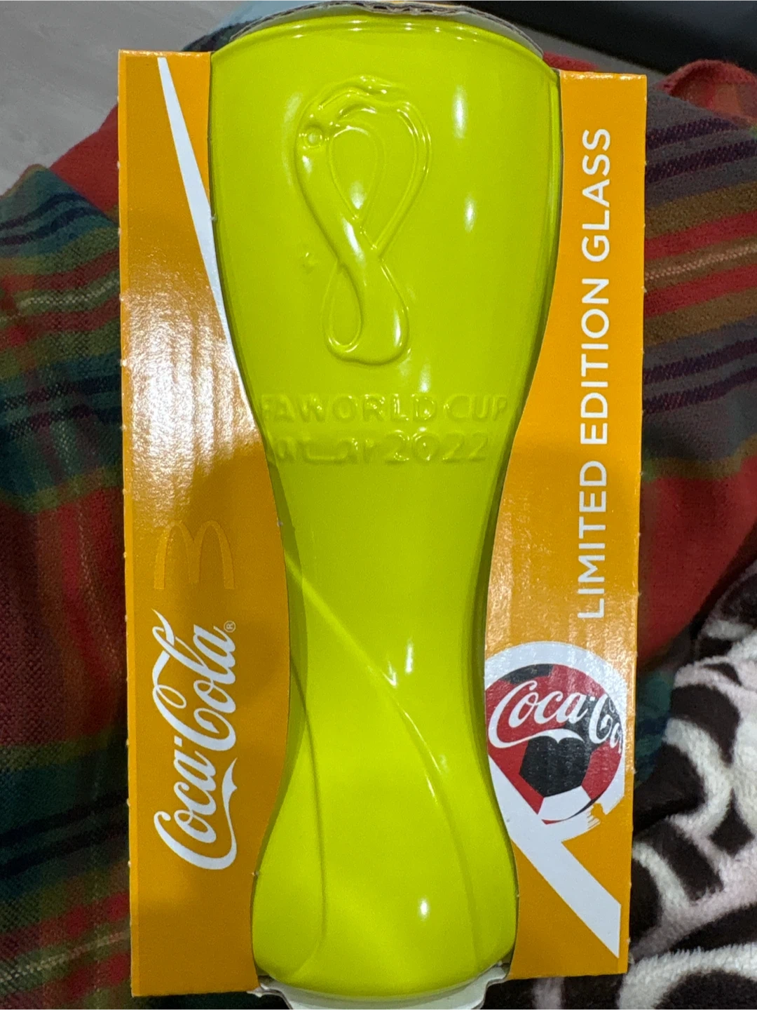 Selling a limited edition Coca-Cola FIFA World Cup 2022 glass! This glass is a vibrant yellow and comes in its original box. It's part of a collection of 6 glasses. The capacity is 360 ml. A great addition for any collector!