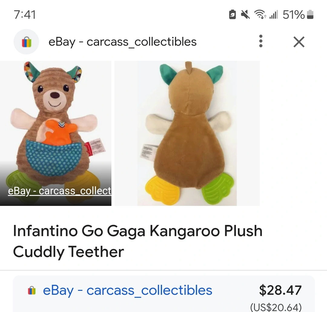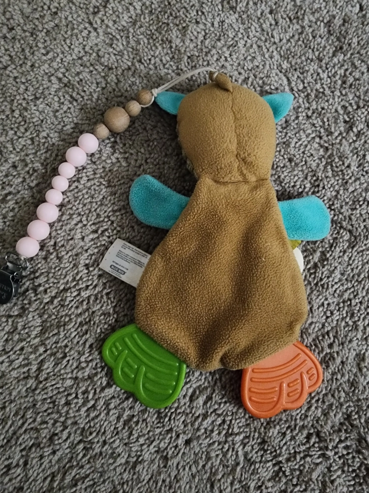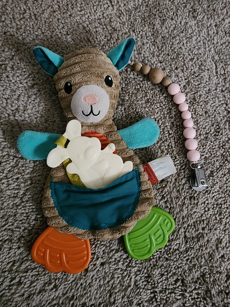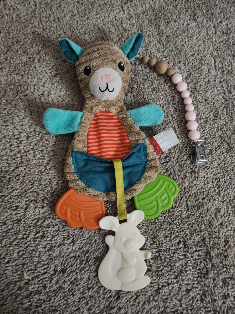 This is a cute plush kangaroo toy that is perfect for babies who are teething. It has a variety of textures and colours to keep babies entertained. It has a clip to attach to a stroller or car seat.