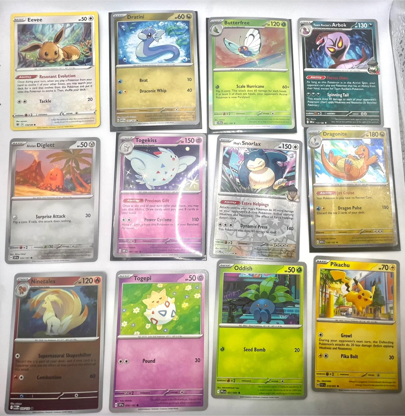 Collection of various Pokemon trading cards. Includes popular characters like Squirtle, Charmander, and Eevee. These cards are ideal for collectors or players. Card condition all MINT.