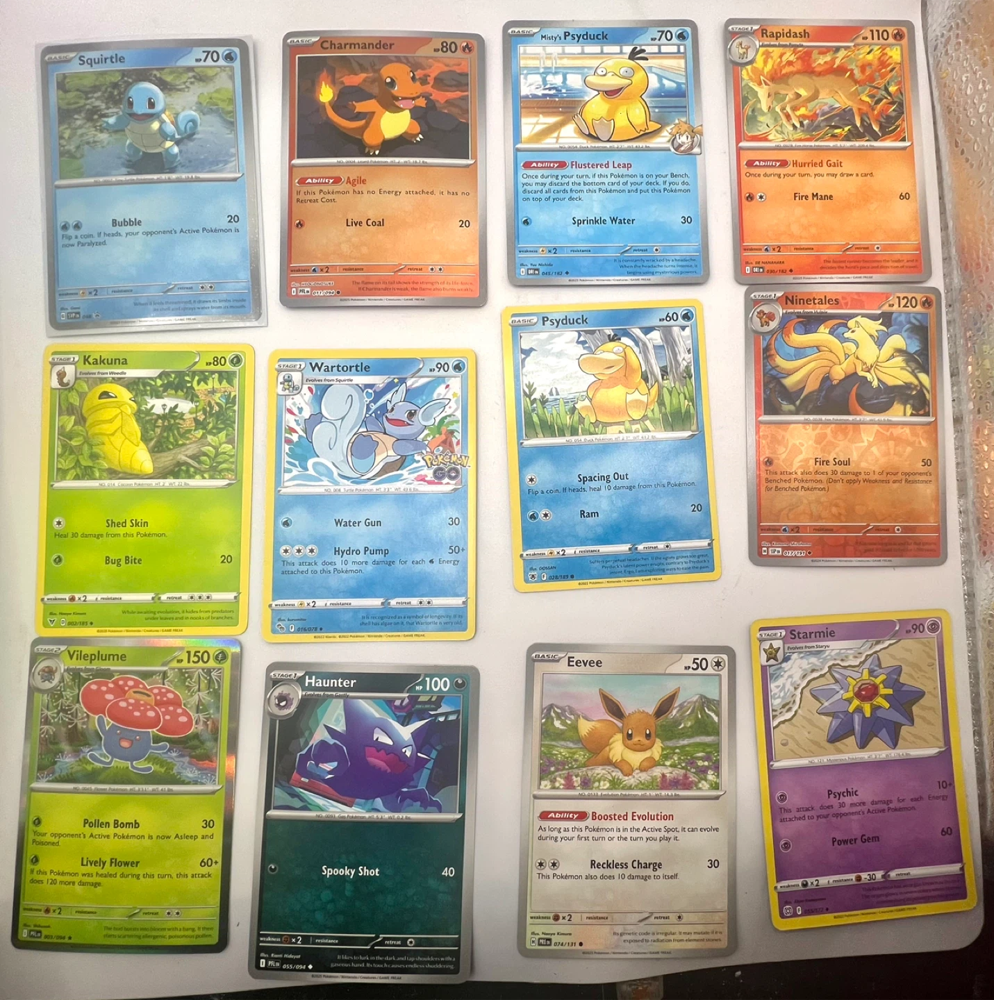 Collection of various Pokemon trading cards. Includes popular characters like Squirtle, Charmander, and Eevee. These cards are ideal for collectors or players. Card condition all MINT.