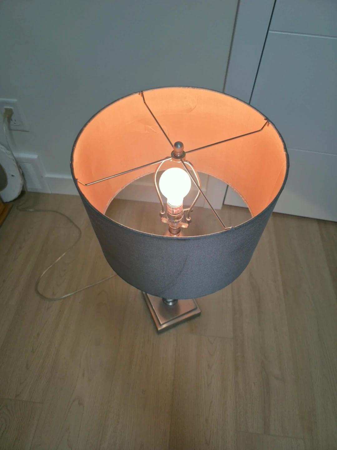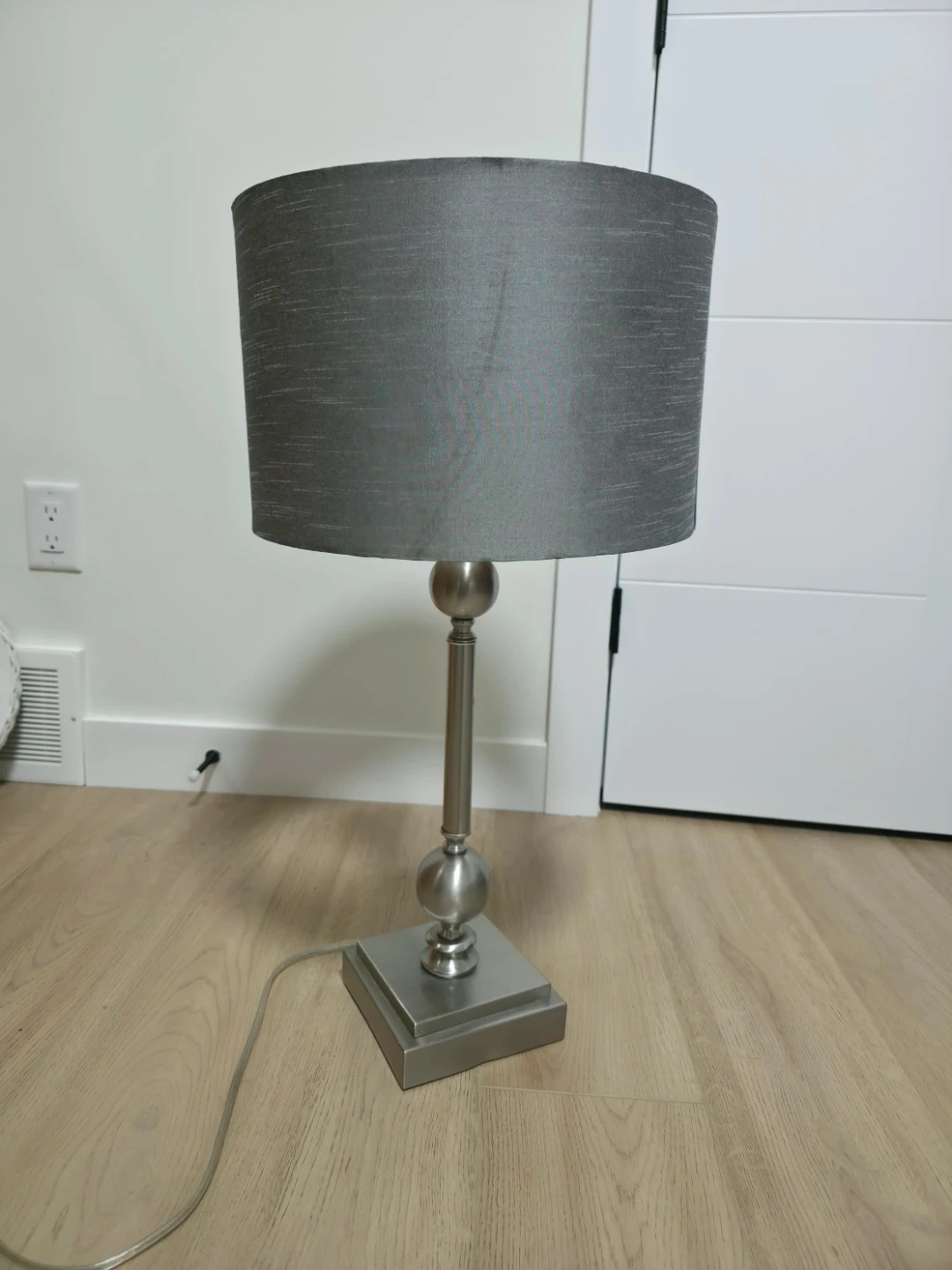A stylish table lamp with a gray fabric shade and a sleek silver base. It would look great in a living room or bedroom! The lamp provides a warm and inviting light