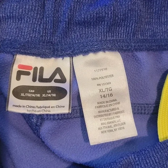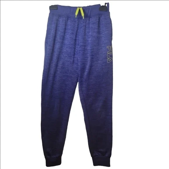These Fila joggers are in great condition! They're a size XL (14/16) and made of 100% polyester. The colour is a nice shade of blue, and they have a comfortable fit.